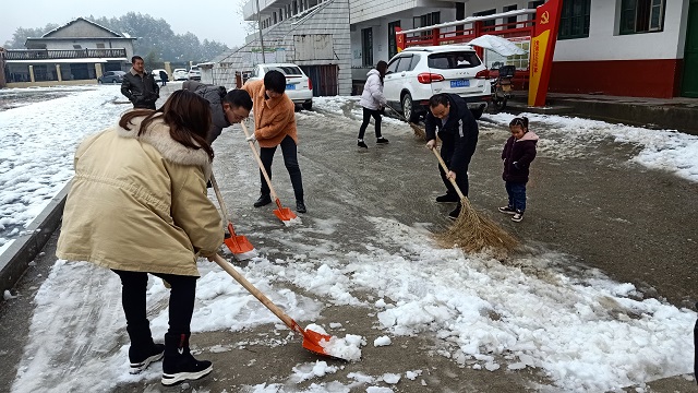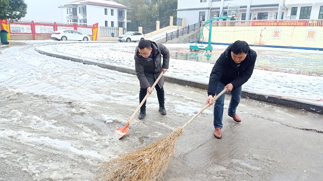 支部书记胡斐组织全体党员、积极分子对入校主干道、操场周围进行积雪清理工作,经过一个多小时的清理,大部分的积雪已被清扫干净,为学生返校学习提供了安全的保障。