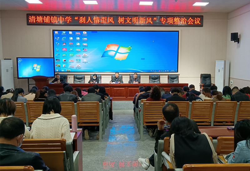 本网讯 4月6日晚,清塘铺镇中学在学校多功能报告厅召开“刹人情歪风 树文明新风”专项整治会议。 校长谭宏光同志传达了中心校会议精神,并组织学习《安化县“刹人情歪风 树文明新风”专项整治工作方案》,重点解读了整治内容、工作步骤、工作要求。他强调,全体教职员工务必提高思想认识,扎实悟透方案精神,明确人情歪风红线,坚守师德师风底线,以昂扬的斗志、务实的作风,全力推进“刹人情歪风 树文明新风”专项整治工作,大力倡导社会文明新风尚,切实防止人情歪风反弹,使文明之花在美丽的校园绽放。 会前,全体教师签署了《安化县“刹人情歪风 树文明新风”专项整治承诺书》。(通讯员:张剑文、吴雄)