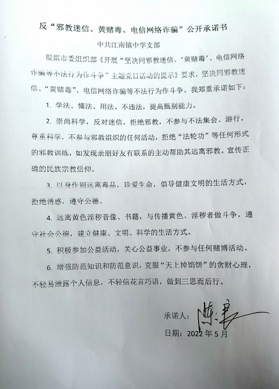 本网讯 5月13日下午2点半,江南镇中学在二楼会议室召开“反邪教迷信、黄赌毒、电信网络诈骗”为主题的五月份主题党日活动,该校党员教师、入党积极分子参与,活动由支部书记陈良主持。 陈良同志组织观看了有关邪教、电信诈骗、黄赌毒知识,号召大家自觉抵制黄赌毒、电信诈骗等,共同守护校园平安。宣传委员陶志远组织学习了湖南省宗教事务条例(节选),了解了宗教的有关知识,从而帮助参会人员更好地区分邪教。党建专干黄新良上了一堂精心准备的党课《反邪教,党员做先锋》,进一步加强党员教师意识形态领域教育,认识邪教的严重危害性,坚决防止邪教组织渗透侵蚀。 会上,党员们通过分享发生在身边的案例,更加深刻认识到反邪教迷信、黄赌毒、电信网络诈骗的重要性。大家自觉签订了反邪教迷信、黄赌毒、电信网络诈骗公开承诺书,纷纷表示要在今后的教学和生活中发挥党员先锋作用,为学校的平安稳定做贡献(通讯员 黄新良)