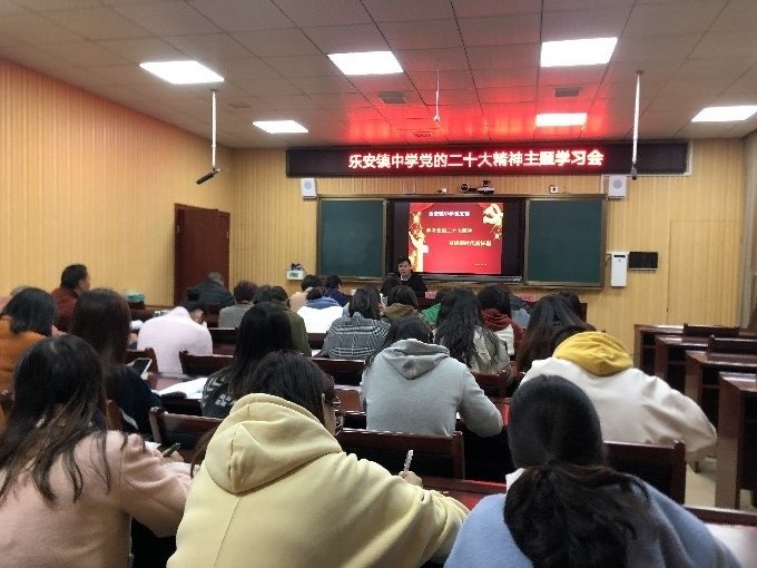 本网讯 11月13日晚,乐安镇中学党支部召开全体教师会议,学习贯彻党的二十大精神。会上,宣传委员蒋依老师组织全体党员教师重温入党誓词。该校党支部书记袁东做了《学习党的二十大精神,奋进新时代新征程》的专题发言,解读和阐明党的二十大精神的核心内容和精华。袁东说:作为一名基层党支部书记,要立足发挥基层党组织职能作用,扛起政治责任,加强党的领导,带头学习贯彻党的二十大精神。他要求教职工要深入学习领会党的创新理论,全面贯彻党的教育方针。 会上还组织收看了党的二十大报告的解读视频《非凡成就,伟大变革》和《理论创新,行动指南》。