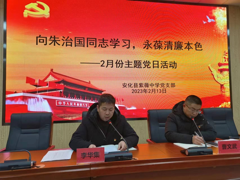 本网讯 2月13日下午,安化县紫薇中学党支部在学校大会议室开展2月份主题党日活动。 全体党员怀着崇敬的心情观看了《一名组织部长的生命答卷》——青海省委组织部原副部长朱治国同志先进事迹的视频,大家深受感动。朱治国同志始终以人民公仆标准要求自己,担当作为,奋勇争先,带领人民不断开创各项事业发展新局面,用生命书写了一名组工干部的忠诚、干净和担当。 学校党支部采取“2+X”学习课堂方式进行了研讨交流,党支部书记曹文武在交流中说到,朱治国的先进事迹令人震撼,我们要以朱治国同志为榜样,汲取他身上的优秀品质,始终坚守共产党人的政治本色和价值追求,不忘初心、拼搏奋进,做一名政治素质、能力本领、工作作风全面过硬的教育工作者,用“实打实”的作风和行动为师生员工服务,扎扎实实做好本职工作,以实际行动践行全心全意为人民服务的根本宗旨。