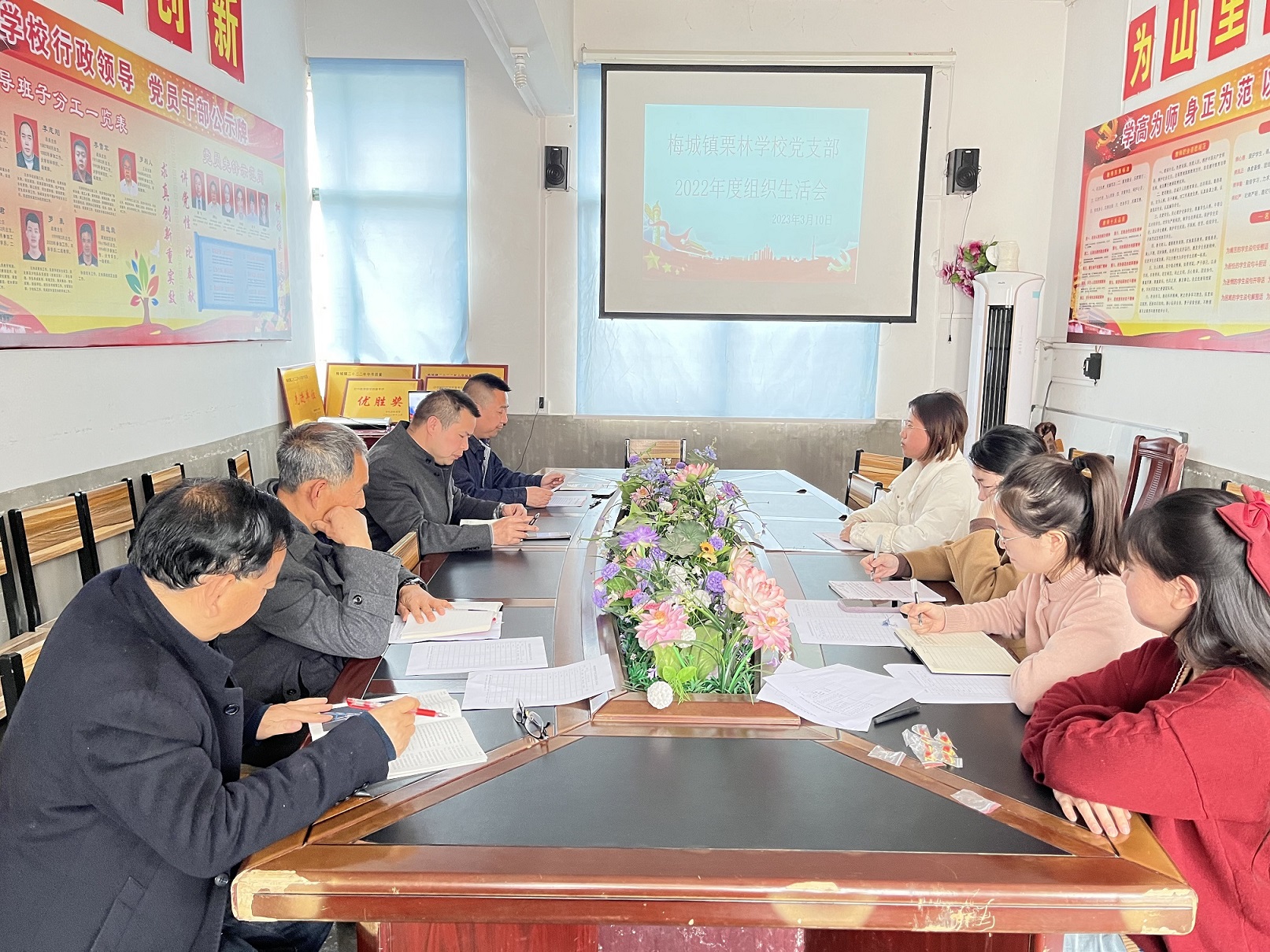 本网讯 3月10日下午,梅城镇栗林学校党支部召开了2022年度组织生活会暨民主评议党员大会。会议由学校党支部委员李秀慧主持,梅城镇中心学校联点领导冯佑民、学校全体党员参加会议。 会前,支部组织党员集中学习党的二十大精神、党章和省委十二届三次全会、市委七届三次全会等重要会议精神,广泛征求意见,深入进行谈心谈话,认真查摆问题并形成问题清单,为本次组织生活会的召开奠定了基础。 会上,学校党支部书记高飞进行了2022年度党支部工作述职。随后支部班子带头开展批评与自我批评,支部党员逐一进行批评与自我批评。全体党员从政治信仰、党员意识、理论学习、能力本领、作用发挥、纪律作风等方面,紧密联系工作实际,深刻剖析了存在的问题,并进行了民主测评。 冯佑民对会议进行了点评,指出会前准备较为充分,批评与自我批评实际、中肯,效果较好。同时他也希望栗林学校继续坚持高标准、严要求,争取今年的教学再创佳绩。