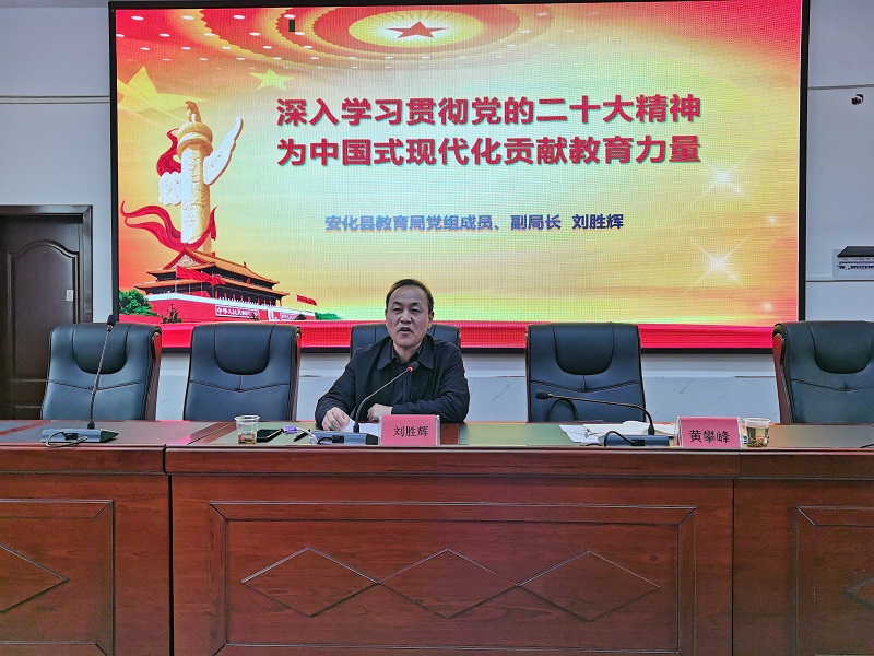 刘胜辉以《深入学习贯彻党的二十大精神,为中国式现代化贡献教育力量》为题,从三个方面,结合安化教育发展实际与马路教育现状,对党的二十大精神作了全面宣讲和深入阐释。刘胜辉提出,要在全面肯定新时代新成就中坚定自信;要在全面领会新思想新内涵中明确目标;要在全面贯彻新战略新部署中彰显担当。他结合一些生活实例与具体数据,生动形象、深入浅出地与大家进行分享。他要求马路学校全体党员同志率先垂范,认真学习贯彻好党的二十大精神,落实在行动中,真正当好先锋。 刘胜辉强调,要以办好人民满意的教育、全面建设教育强县为目标,加强党对教育工作的全面领导;深入落实立德树人的根本任务,全面提升教育教学质量,涉及教育观念、教育体制、教学方式的全方位调整,需要做到老师“教好”、学生“学好”、学校“管好”三位一体,要穷尽一切手段,不惜一切代价,用好一切资源抓教育教学质量。 刘胜辉寄语马路镇全体党员教师、积极分子,要秉承“令公桃李满天下,何用堂前更种花”的豪情,为当代新青年当好引路人,主动融入中国式现代化建设的生动实践,矢志不渝、竭力而为,把马路教育办好、把安化教育办好。