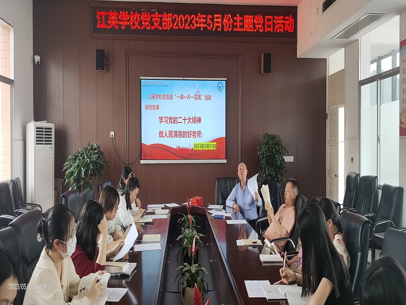 本网讯 5月15日下午,江英学校党支部在党员活动室组织开展5月份主题党日活动,支部全体党员按时参加。 会上,党员集中观看红色教育片,集体学习习近平总书记在全国宗教工作会议上的重要讲话;学习《习近平总书记关于抓落实重要论述摘录》;对民主评议评出的8名优秀党员进行表彰。 在活动中,党支部副书记刘艳组织重温益阳市委组织部关于开展“一课一片一实践”活动的文件精神,要求每个党员讲一次微党课、每月观看一次红色教育片、组织开展一次社会实践活动。党建专干王光明以《学习党的二十大精神,做人民满意的好老师》为题,率先为党员们讲了第一堂微党课,他紧密联系学校实际,对怎样才能成为人民满意的好老师进行了深入浅出的阐述,认为要做人民满意的好老师,必须先做受学生欢迎(喜欢)的老师!勉励党员教师特别是青年教师要拓展专业提升,要加强教师基本功训练,作为教师要能说会写,即会讲课,会写文章,还要写得一手好字。努力成为有“有理想信念、有道德情操、有扎实学识,有仁爱之心”的“四有”好老师。