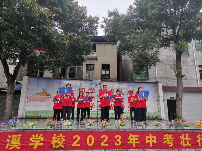 本网讯 6月16日上午,全体行政、初中部全体教师及学生在操行集合,参加由敷溪学校党支部、政教处和教导处联合为九年级学生举行的中考壮行活动。 国歌奏响,国旗上升,中考壮行活动拉开帷幕。七八年级的学弟学妹们为九年级的全体学生送上最真挚的祝福,希望他们都能中考夺魁,树立榜样。九年级的学生代表立誓,必将全力以赴,拿下“中考”。九年级教师代表殷聪告知学生们:“不要犹豫、不要怀疑,你们是敷溪学校最优秀的学子!”愿以梦为马,不负韶华。校长陶武军如长辈般殷切期盼着却又不厌其烦地交代着,要学生们不要紧张、沉着冷静、仔细做题、反复检查。我们全体师生在敷溪学校等待着“战士们”的凯旋。 为缓解紧张压抑的气氛,全体党员携全体行政、九年级全体教师进行诗歌朗诵,回首着这三年的点点滴滴,期盼着学子们中考大捷。我们坚信,你们一定会披荆斩棘,再创辉煌,奋力拼搏,书写华章!