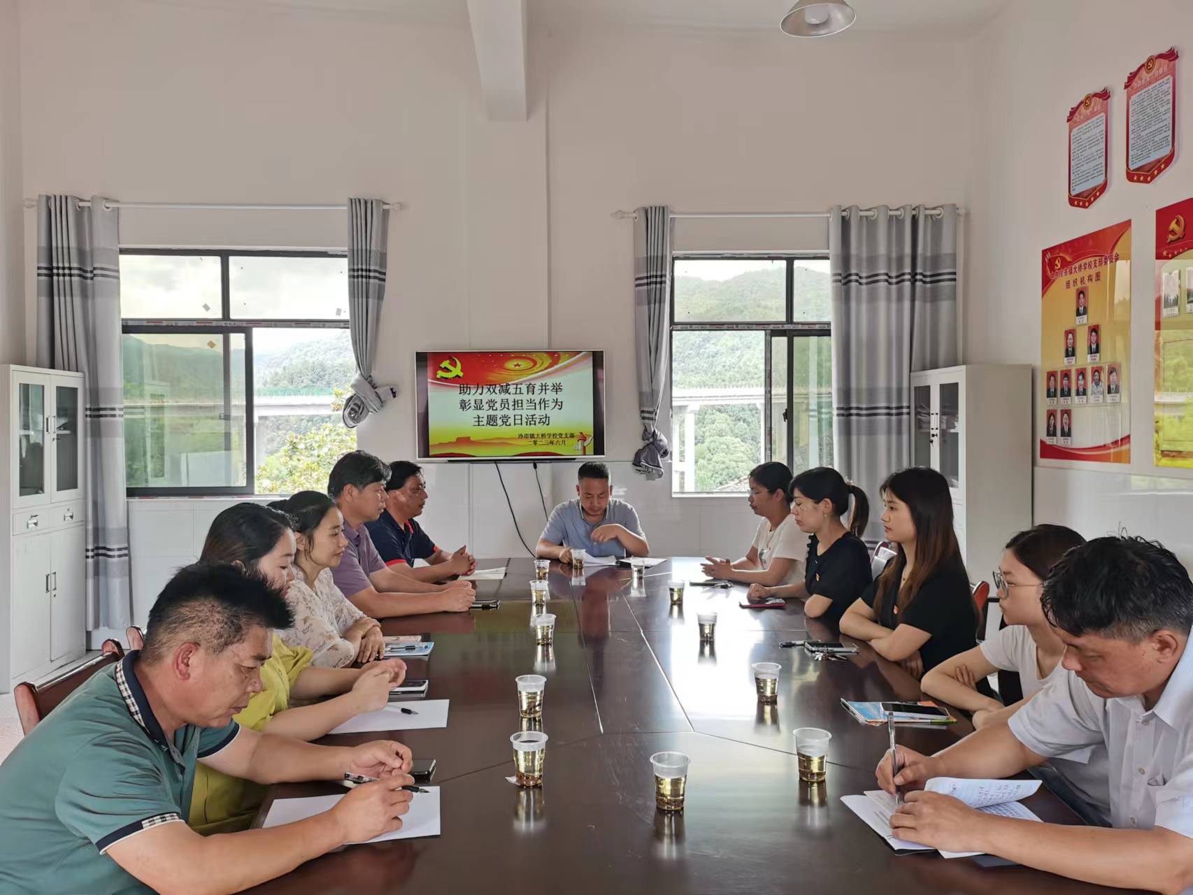 本网讯 6月20日,冷市镇大桥学校党支部组织全体党员教师、积极分子,举行“助力双减五育并举 彰显党员担当作为”主题党日活动。 党员教师集体学习《中国共产党廉洁自律准则》《关于新形势下党内政治生活的若干准则》,观看党员教育片。 支部书记、校长黄军结合自身经历和工作实际,他表示要做到牢固树立服务意识,担当作为,主动融入师生工作学习生活,积极为师生排忧解难。在平凡的教书育人工作岗位上,履职尽责,在探索完善双减、五育并举的新形势下,全面贯彻党的教育方针,创新工作,建功立业,书写党员教师精彩人生。 党员教师周颖在专题讨论时发言:全面贯彻党的教育方针,是新时代教育工作者的责任使命。作为青年党员教师要安心扎根农村教育,不负青春韶华,不负家长重托,沉下心,俯下身子,把每一名孩子教育培育好,长大成为社会主义建设者和接班人。
