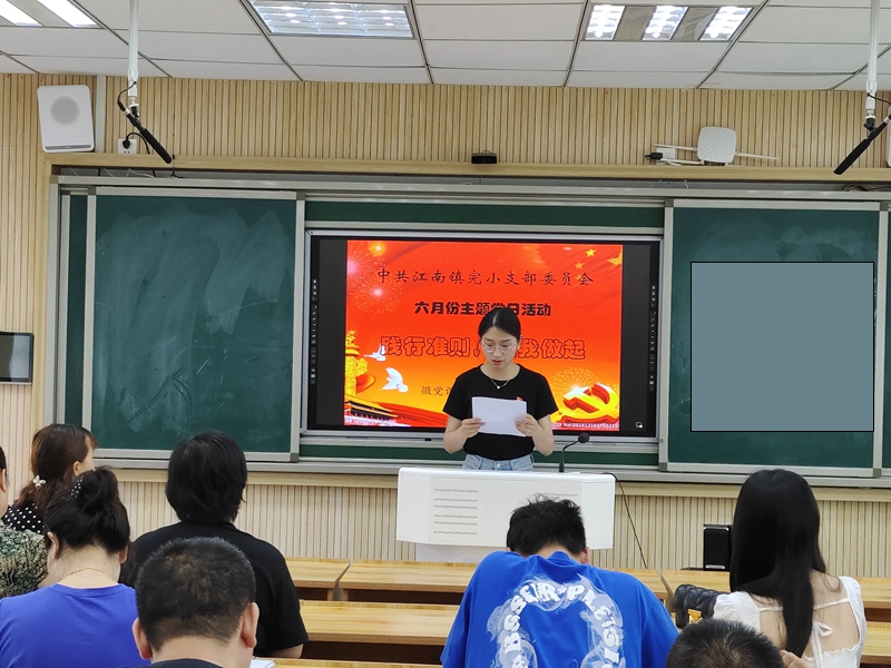 本网讯 6月21日,江南镇完小党支部组织开展“增强党性 廉洁自律”主题党日活动,全体党员参加,党建专干朱志兵主持。 会议组织观看党员教育片,重温中国共产党入党誓词。第四学习小组陶清远讲微党课——《践行准则 从我做起》,倡导全体党员教师清白做人,干净做事;第四学习小组姚志军对《中国共产党廉洁自律准则》进行全面解读,重点对“四个坚持”“四个自觉”进行生动形象的诠释。以学习小组为单位,就如何践行《中国共产党廉洁自律准则》进行了热烈的讨论。 会议强调:全体党员要注重党性修养,坚持务实清廉的价值追求,爱岗敬业,廉洁从教,努力践行为国育才的初心使命。