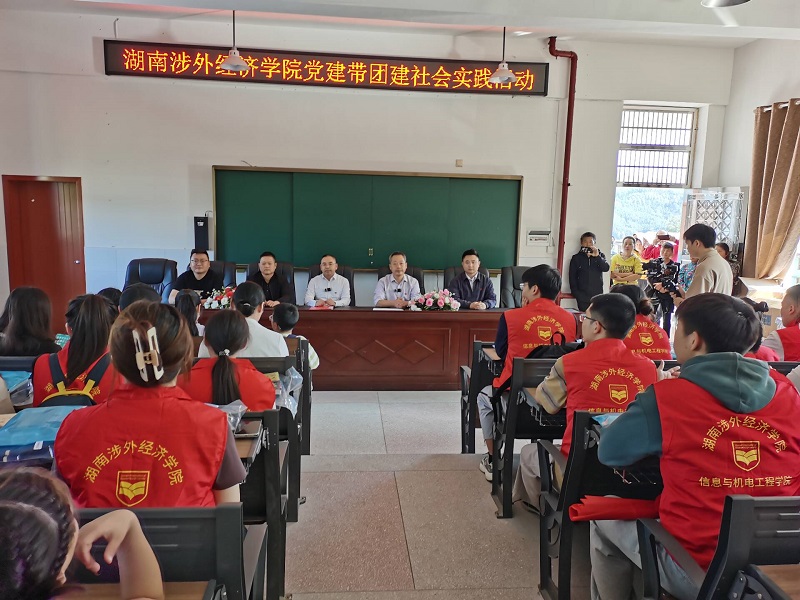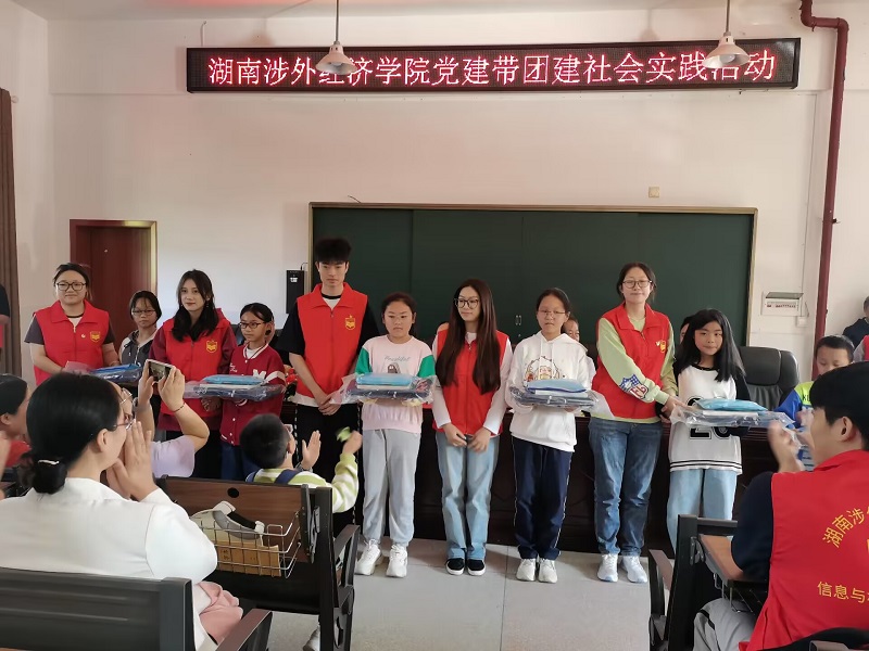 本网讯 10月21日,湖南涉外经济学院信息工程与机电工程学院党总支书记唐志文、党总支副书记吴斌带领党员、团员、志愿者一行46人,来到冷市镇大桥学校开展“学思践悟党的二十大筑梦奋进新征程”三下乡活动。 在该校梯形教室,志愿者们与该校领导和部分师生代表齐聚一堂,举行了“党建带团建社会实践活动”启动仪式,大桥学校校长黄军对各位党员、团员志愿者不辞辛苦,来到乡村学校开展社会实践活动,表示热烈欢迎,向客人介绍了学校办学条件和教育教学情况。唐志文表示,湖南涉外经济学院、信息工程与机电工程学院以党建带团建,选择冷市镇大桥学校作为社会实践基地,通过开展形式多样的活动,加强彼此交流互动,助推三下乡活动走深走实。志愿者代表表示:将尽自己的绵薄之力关注农心山区学校发展和孩子们的健康成长,实地体验农村学校师生工作学习、生活环境,让党员、团员、志愿者们感受一份社会责任与担当,以大手牵小手,传递爱心接力棒,助力乡村振兴。 在热烈友好的气氛中,唐志文代表湖南涉外经济学院、信息工程与机电工程学院,向冷市镇大桥学校授予社会实践基地牌匾。并向100名品学兼优和家庭困难学生代表赠送了价值3万余元的书包、图书、文具等学习用品。志愿者们与学生代表进行面对面的对话交流,进一步了解孩子们思想、学习、生活以及家庭情况。 仪式结束,志愿者们还不顾旅途劳累,在学校相关人员陪同下,翻山越岭走访慰问特困学生家庭。(通讯员 黄超平)