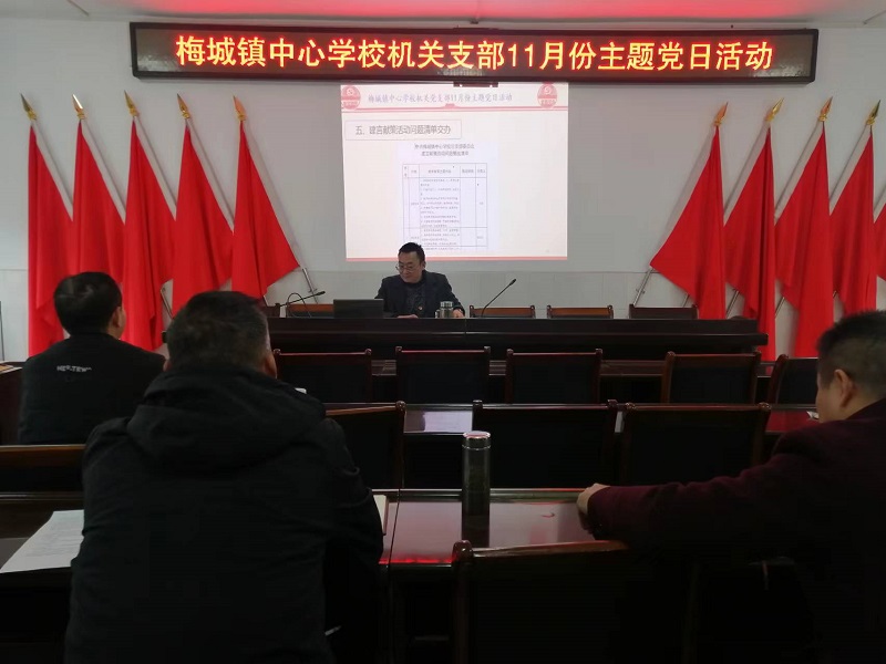 本网讯 11月14日,梅城镇中心学校机关支部举行11月份主题党日活动,活动由中心学校党总支书记贺荻主持。 活动重点讨论中心学校总支委员会上周开展“校长与教师面对面”建言献策走访所收集到的问题,问题整理共96个,包括规范食堂管理、课后服务、学校发展规划、教师队伍建设、教师培训、离退休教师节日慰问、党组织领导下的校长负责制、关注教师身心健康、重视学校艺体工作、其它共10大块。中心学校各块口分管负责人分别针对教师的建议和意见谈工作措施和解决办法,广开言路,共谋良策,通过集思广益,很多问题解决已达成共识,形成决议。贺荻表示,所收集到的问题是阻碍梅城教育良性发展的“绊脚石”,中心将高度重视,进行具体抓好落实,本周星期四将召开各学校基层干部会集中进行反馈与部署。 会上,中心学校党总支副书记刘志灵通报了党员积分情况,组织全体党员进行了主题教育学习,观看了党员教育片《县委书记的“专车”》《新时代文化/思想之旗》,并上微党课《深入学习贯彻习近平总书记关于教育的重要论述》。