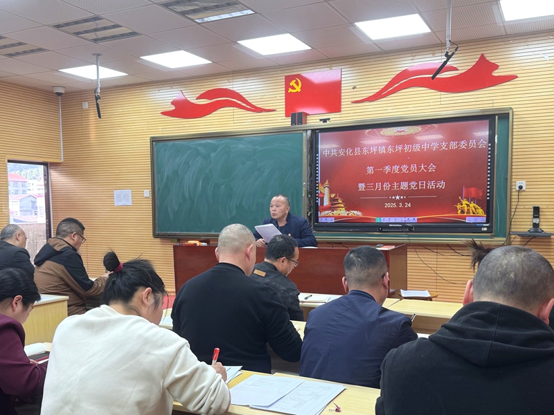 本网讯 3月24日,东坪镇中学党支部第一季度党员大会暨三月主题党日活动在党员活动室举行。 专题学习中,黄桃开借助多媒体讲解《习近平总书记关于党的建设的重要思想概论》部分章节,强调其对教育工作的指导意义;带领党员研读《经济工作必须统筹好几对重要关系》,结合教育行业经济现象探讨,并通过新闻视频学习全国两会教育相关内容。 在 “一课”“一片”“一实践” 活动中,党员观看教育片《第一视点:沿着绿色发展之路坚定不移走下去》,探讨校园绿色发展举措。3名党员教师讲 “微党课”,分享分享教学中践行雷锋精神、贯彻国家政策的经验。 活动中,党员们围绕学习内容深入研讨交流,刘卫安带来第一季度党课《学习两会精神 奋进育人征程》,并强调师德师风工作与特殊学生结对帮扶安排,最后支部书记王飞进行总结。 初审初校:王子慕 复审复校:邓峥 终审终校:刘卫安