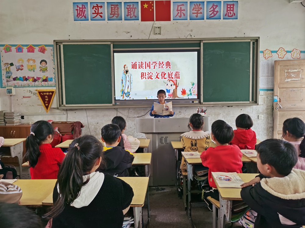 本网讯 自开学以来,江南镇陈王完小积极开展“诵读国学经典,积淀文化底蕴”诵读活动。 开学初,学校积极营造“诵读国学经典,积淀文化底蕴”的书香校园氛围,利用宣传栏、班级文化建设等形式,让学生随处可欣赏到古诗文佳作佳句,在有意、无意之中将古诗文记住,以实现“量”的积累。充分汲取古诗文的精华,得到古文化的浸润,厚积而薄发把经典诵读、古诗吟诵与语文教学结合起来,引导学生学以致用。 学校政教处制定活动方案,语文老师具体实施。定时间,定责任人,每天安排二十分钟的经典诵读时间,在各班主任、语文老师周密组织下,学生活动以班为单位,采取教师带读辅导、学生齐读、优生领读、自由对读等多种形式,让学生吟诵。
