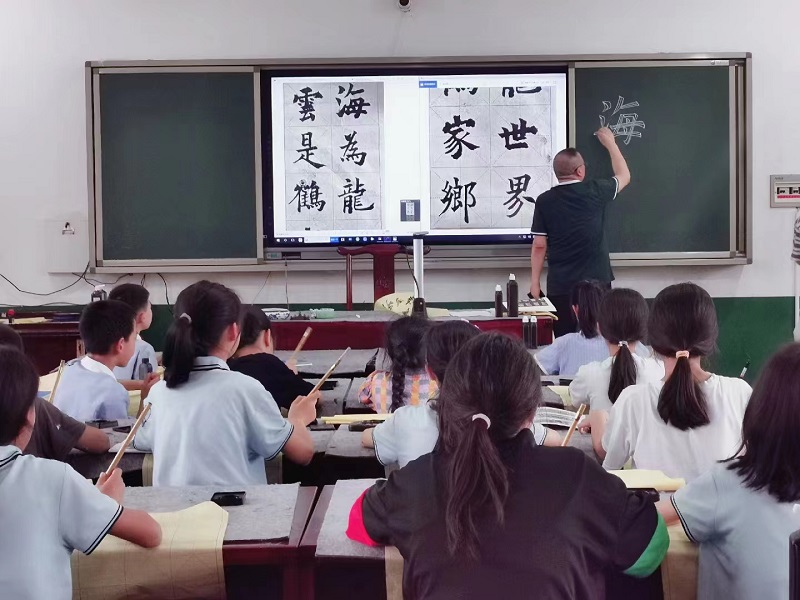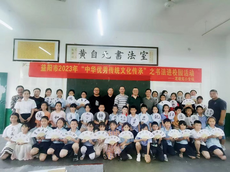 本网讯 6月25日,益阳市书法家协会组织的“中华优秀传统文化传承”之书法进校园活动在龙塘镇完小举行。 此次活动由益阳市书协主席团成员、安化县书法家协会主席王卫国,县书协副主席、黄自元书画院院长黄安石,县书协副主席兼秘书长彭凡卿,安化凤翥英才书法学校校长吴凤翥等一行到学校现场授课交流。龙塘完小校长王勋及爱好书法的师生共60余人参加。 本次活动分软笔和硬笔专场。王卫国亲自示范软笔书法,对黄自元楷书进行赏析讲解,并以“海为龙世界,云是鹤家乡”八个极具代表性、不同偏旁结构的字为例,传授基本笔画和书写技巧。