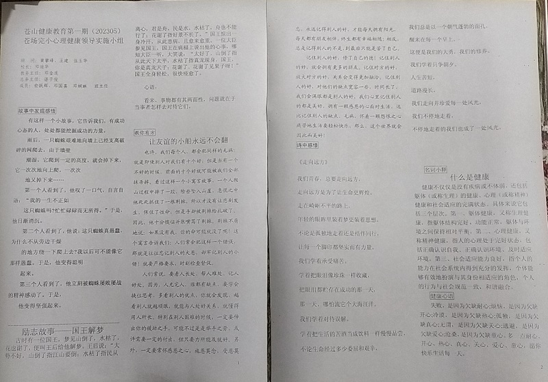 本网讯 5月30日,马路镇苍场完小精心筹办的心灵健康小报第一期推出并在孩子们手中传阅。 小报内容丰富多彩:“蜘蛛故事”启示孩子们,有成功心态的人,处处都能挖掘成功的力量;“大势已去的故事”告诉孩子们,事物都有其两面性,问题就在于当事者怎样去对待它们;“让友谊的小船永远不会翻”引导孩子们,要看人长处、帮人难处、记人好处,这样就会让自己的心更阳光,人生之路更加宽阔。诗歌《走向远方》中的“我们不停地走着,不停地走着的我们也成了一处风光”,警醒的话语在潜移默化地激励着孩子遇挫折不停歇。 该校校长邓迪华表示,健康小报,每月一期,写身边故事,展示温馨心语,读启迪故事,真正达到“以信念滋润信念、用灵魂唤醒灵魂”的目标。