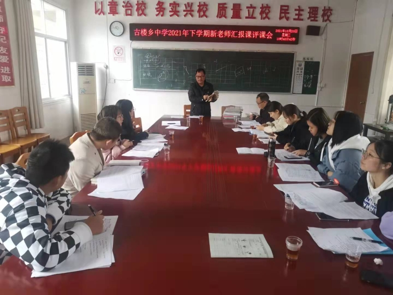 本网讯 10月18日至20日古楼乡中学新教师汇报课教研活动圆满结束。 今年开学伊始学校管理层就谋划如何让新聘教师尽快成长起来。他们选择九月份举行骨干教师教学比武教研活动,通过要求年轻教师参与听课、评课与研讨等校本研训为年轻教师的成长提供学习平台。 三天以来谌叶敏、曾露、杨宴等八位年轻教师的语文、数学、英语、体育、音乐等学科的汇报课充分展示他们一个月以来的学习成果以及对所教科目的胜任。他们的课堂师生互动、激情四溢、精彩连连,令人印象深刻。在课前教务处夏晓勇主任组织“青蓝工程”结对骨干教师指导新教师备课,每位新教师都十分珍惜这次难得的学习机会。中心学校苏建明副校长亲自主持了此次教研活动。他上午前三节课深入课堂听课,及时跟进辅导、及时组织评课、议课。他专业而又犀利直击问题本质的评课风格有时让大家听得有点“心跳”,同时表示佩服。