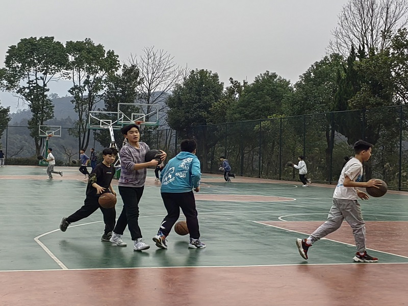 (爱好篮球的学生最多,他们在体育老师指导下做行进中持球运球训练) |