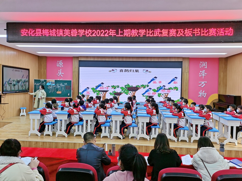 本网讯 4月2日,安化县梅城镇芙蓉学校组织开展教学比武复赛及板书比赛活动。梅城镇中心学校副校长龙永和出席了本次活动。 赛前,各教研组通过初赛评选出组内出色青年教师参加。本次比赛有六位老师入围,进行了教学展示。分别是一年级夏熠老师的语文课《树和喜鹊》、郭芳老师的数学课《找规律》、杨林涓老师的语文课《要下雨了》、龚晓欢老师的数学课《找规律》、肖朵崴老师的美术课《手形添画》、贺颖晖老师的音乐课《雪的世界》。赛中,参赛选手们以全新的教学理念,充分、合理地利用多媒体技术,以独具匠心的设计、扎实的教学基本功、精湛的课堂教学手段和方法,将教研组精心打磨的教学设计展现于课堂,使课堂精彩不断。教学板书,严谨详实,或构思奇特……充分展示了选手们扎实的基本功。赛后,课堂点评环节中教导主任李碧林组织同科目优秀教师进行专业点评,并宣布比赛结果。该校校长王吉阶为获奖教师颁奖,并指出:在双减政策下,教师如何提质课堂,需要每一位老师用心思考。龙永和根据听课情况对老师们如何把握课堂,关注每一位学生、课堂评价等诸多方面提出了更高的要求。 本次活动大大提升了教师的教学技能,让教师有一个精彩的平台展示自身的价值,也给教师们搭建了学习的桥梁,让教师们相互取长补短,为学校长足的发展贡献更多力量。