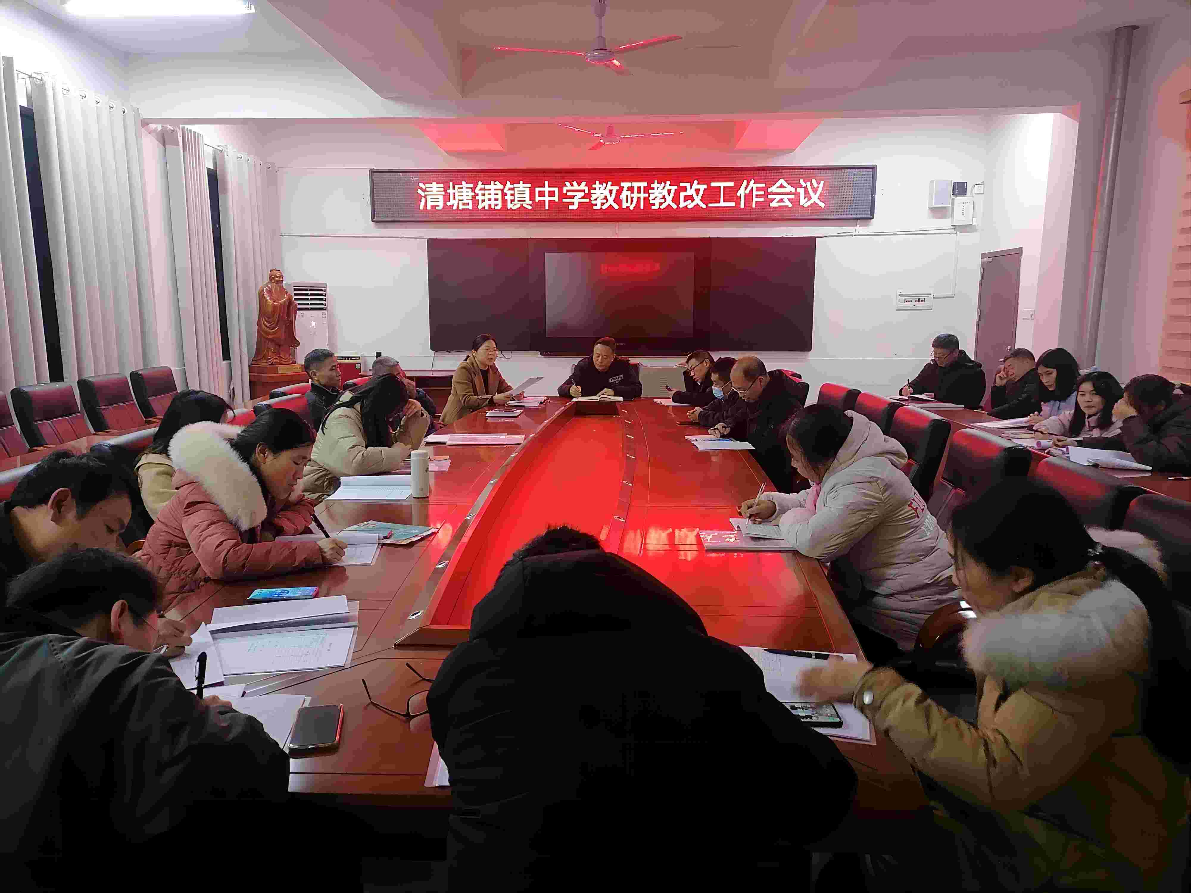 本网讯 2月21日晚7点,清塘铺镇中学在小会议室召开教研教改工作会议,研究部署2023年上学期教研教改工作。学校行政、教研组长、备课组长参加会议。 会上,刘丽莉主任全面总结了2022年下学期教学改革所取得的各项成绩,并重点对2023年上学期的教研教改工作做整体规划。同时对学校各教研组、备课组提出新的工作要求,强调各教研组、备课组要不断更新新课标相关理念,规范实施该校集体备课制度并运用于课堂实践。 校长谭宏光同志肯定了各教研组、备课组在过去一学期的教研工作成果和付出的努力,对本学期教研工作作重要指示。他指出,教研教改工作对提高学校教育教学质量有导向性作用,新学期要求各教研组、备课组进一步规范教研活动,把教学中存在的困惑利用教研活动充分研讨、化解,提高学校教学质量。同时还提议年长教师多向年轻教师传授教学经验,年轻教师多向年长教师虚心学习,以不断提升自身教学能力。