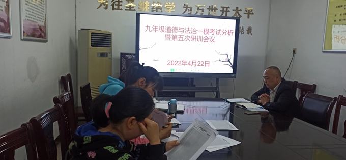本网讯 4月22日上午,东坪镇中学九年级道德与法治备课组在该校小会议室召开一模考试分析会暨备课组第五次研训会议。