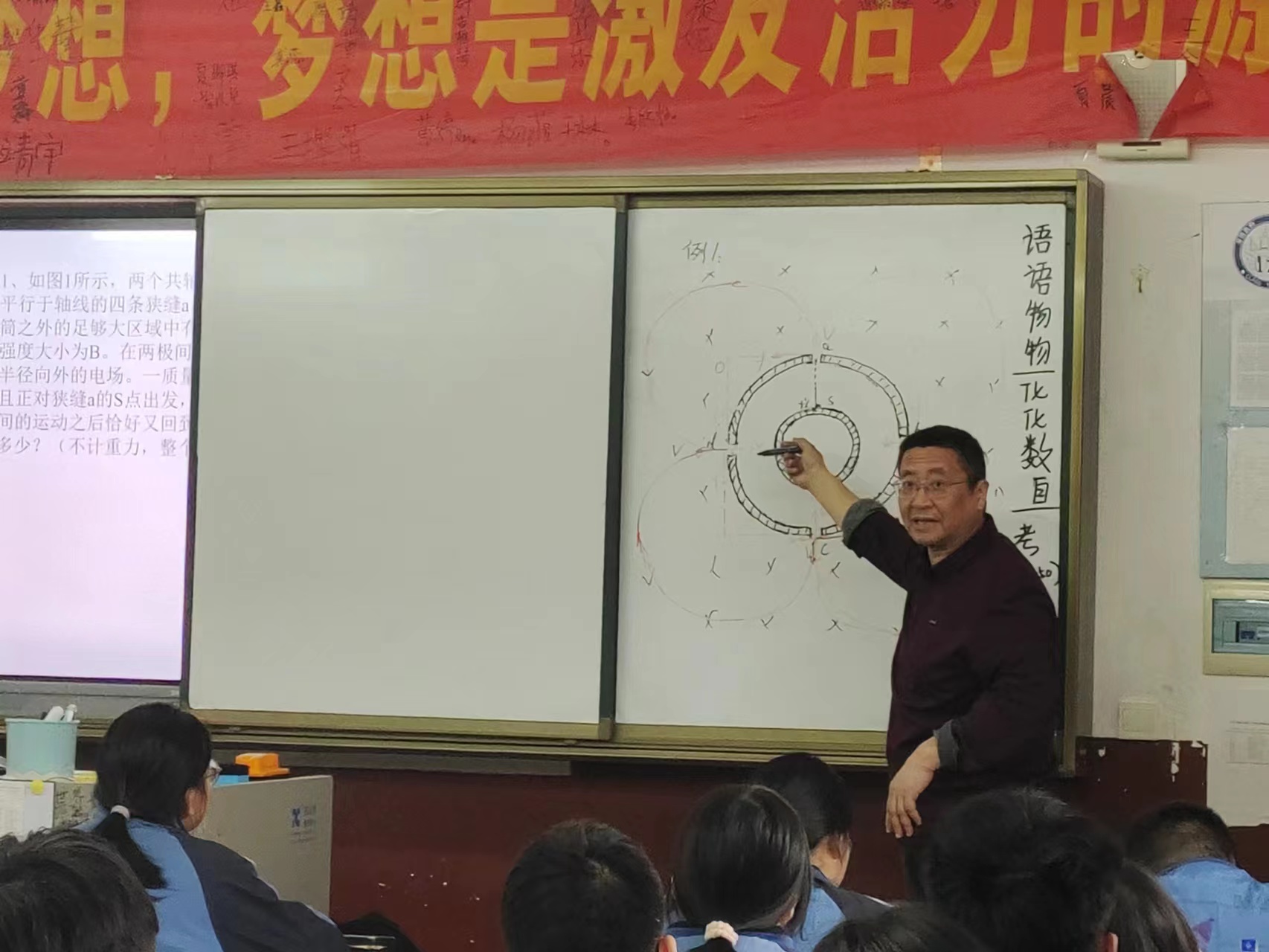 本网讯 3月17日,在安化十二中177班的物理课上,学生和听课教师们全神贯注,看到粒子轨迹在特级教师彭湘平的笔下绽开成一朵漂亮的“梅花”。这是该校物理特级教师彭湘平老师的原创公开示范课《带电粒子在电磁场中运动对称美欣赏》。 在整个教学过程中,彭老师以问题为导向,循循善诱,逐个化解重难点,水到渠成地解决了物理问题。同时,彭老师的课堂打破了学科边界,让人感受到物理之美,呈现出了一种融合共生、整体联动的综合型教学方式,构建了有利于学生和教师全面发展的,新型和谐的教学生态。 参与听课的年轻教师都觉得受益匪浅,认为对自己今后教学思维的转变提供了新的参考方向,为学生更好地学习学科知识提供了理念引导和方法支撑。