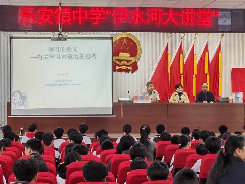 北京外国语大学教授张洪波为师生们带来了一场题为《学习的意义:有关学习内驱力的思考》的主题讲座。张洪波教授是湖南省安化县梅城镇伊泉乡石城村人,她的成长之路与在座的乐安镇中学子们有着相似之处。张教授也是从乡镇学校起步,最终成为北京外国语大学的一名杰出教授。她的求学经历证明了即使起点相同,只要努力不懈,就能够走向更广阔的天地。