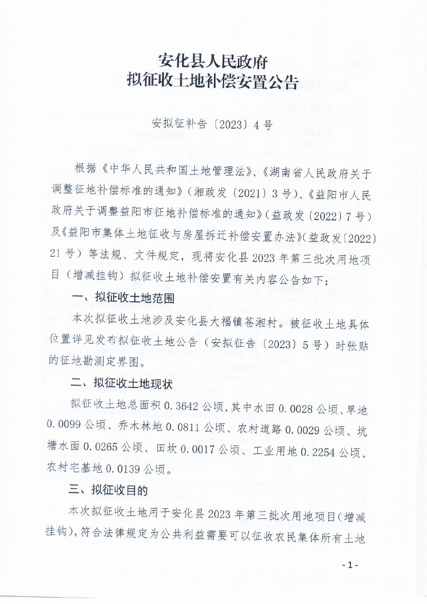 安化县2023年第三批次用地项目(增减挂钩)拟征收土地补偿安置公告安