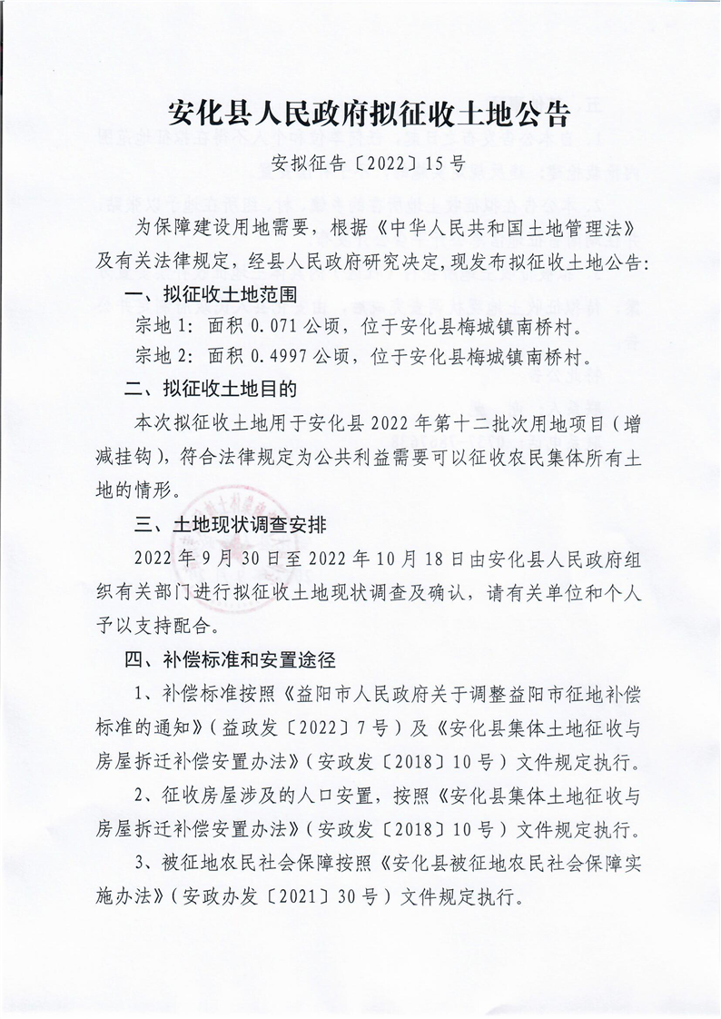 安化县2022年第十二批次用地项目(增减挂钩)拟征收公告
