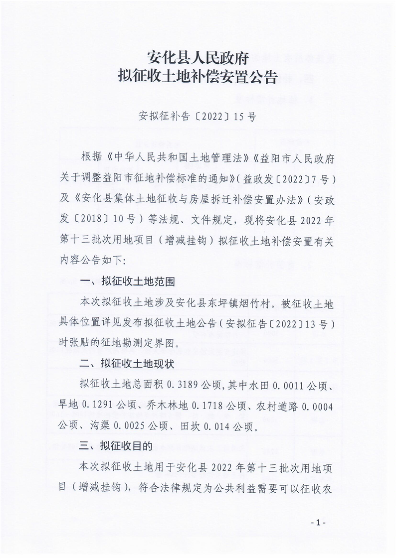 安化县2022年第十三批次用地项目(增减挂钩)拟征收土地补偿安置公告