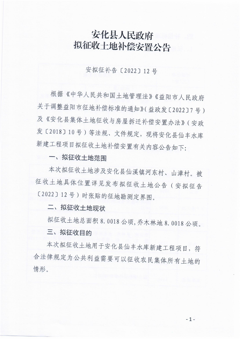 安化县仙丰水库新建工程项目拟征收土地补偿安置公告