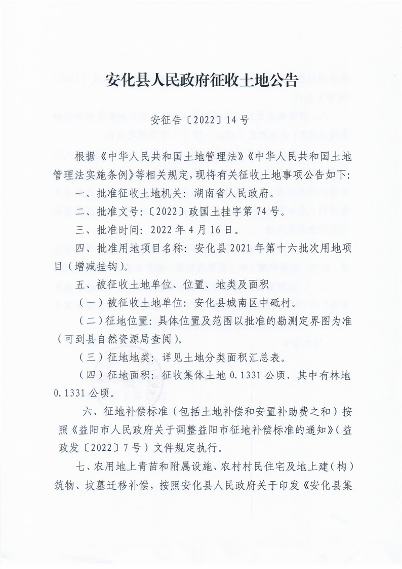 安化县2021年第十六批次用地项目(增减挂钩)征收土地公告