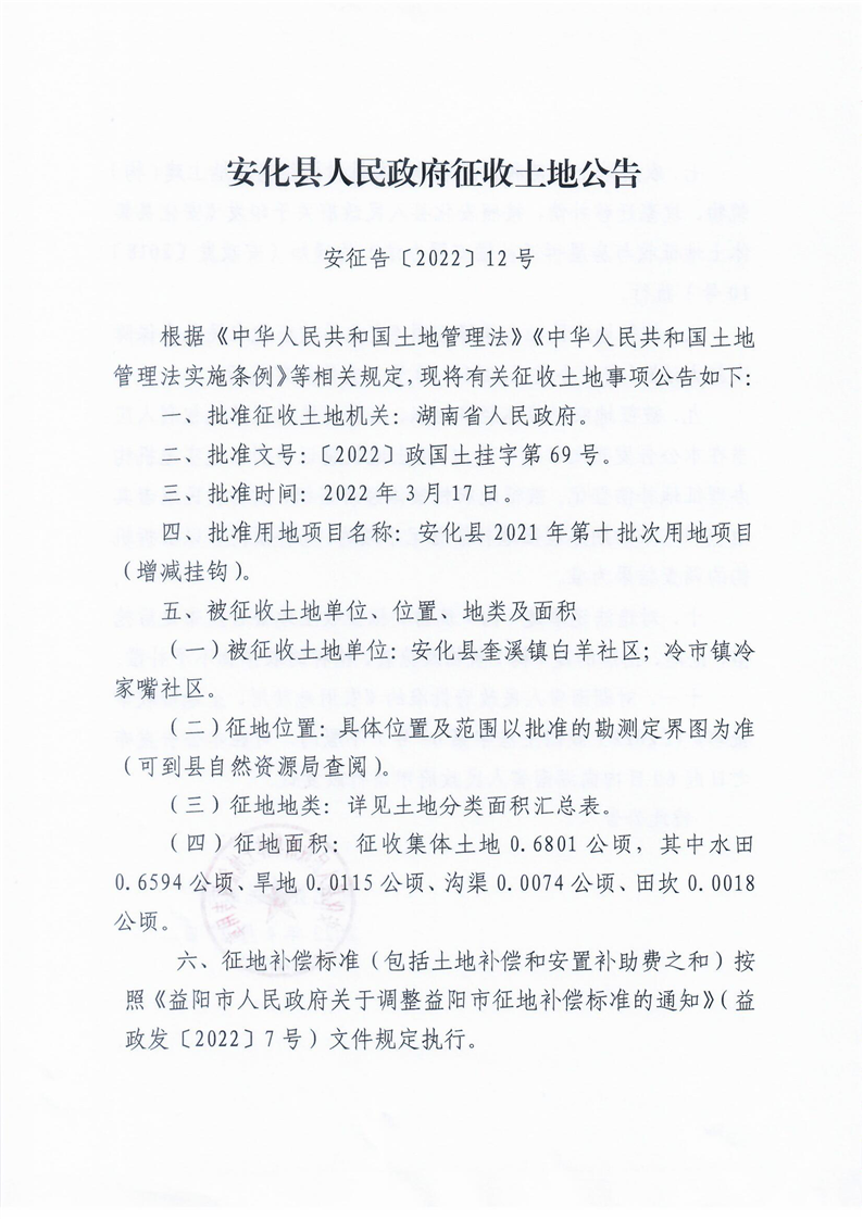 安化县2021年第十批次用地项目(增减挂钩)征收土地公告