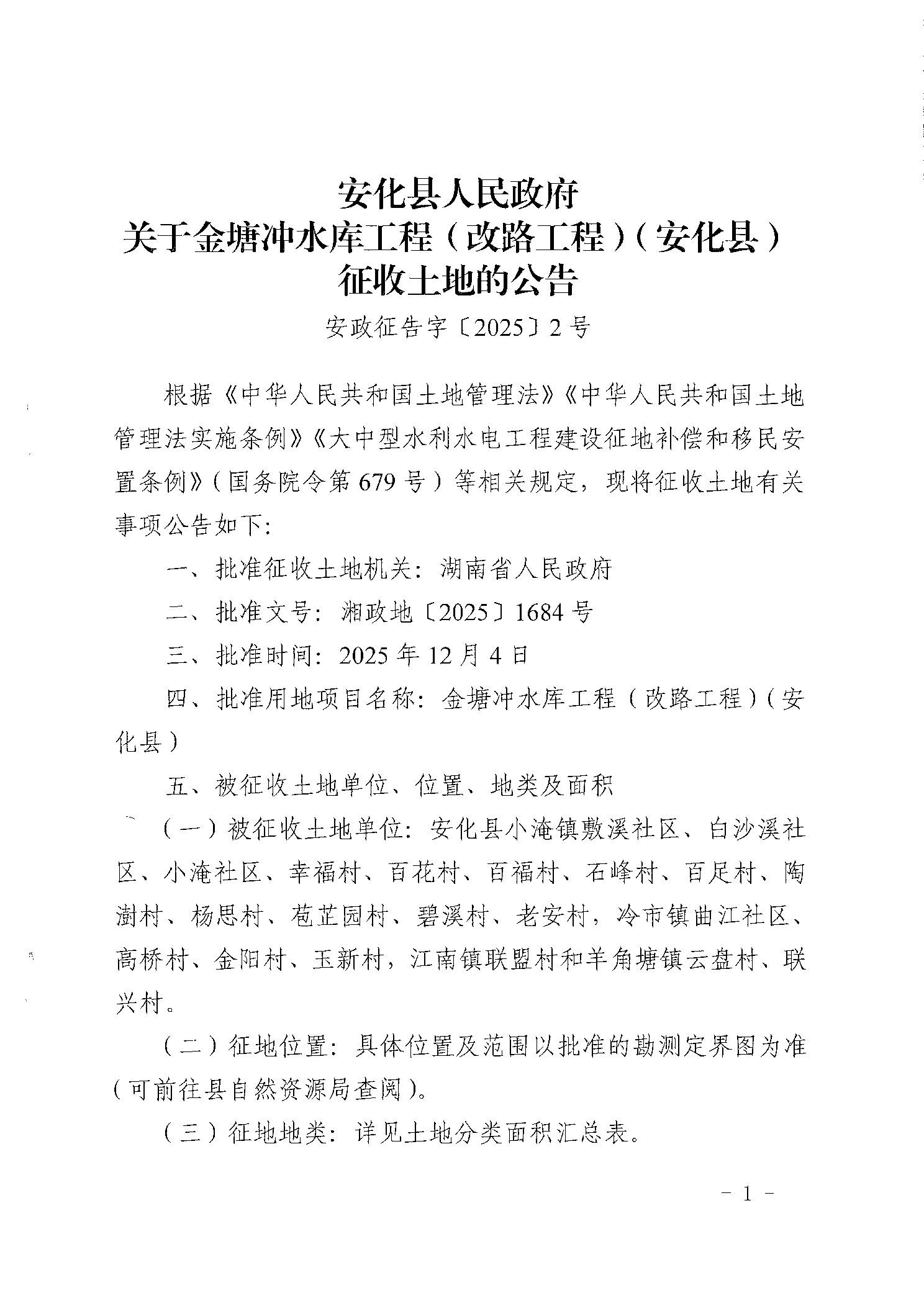 关于金塘冲水库工程(改路工程)(安化县)征收土地的公告