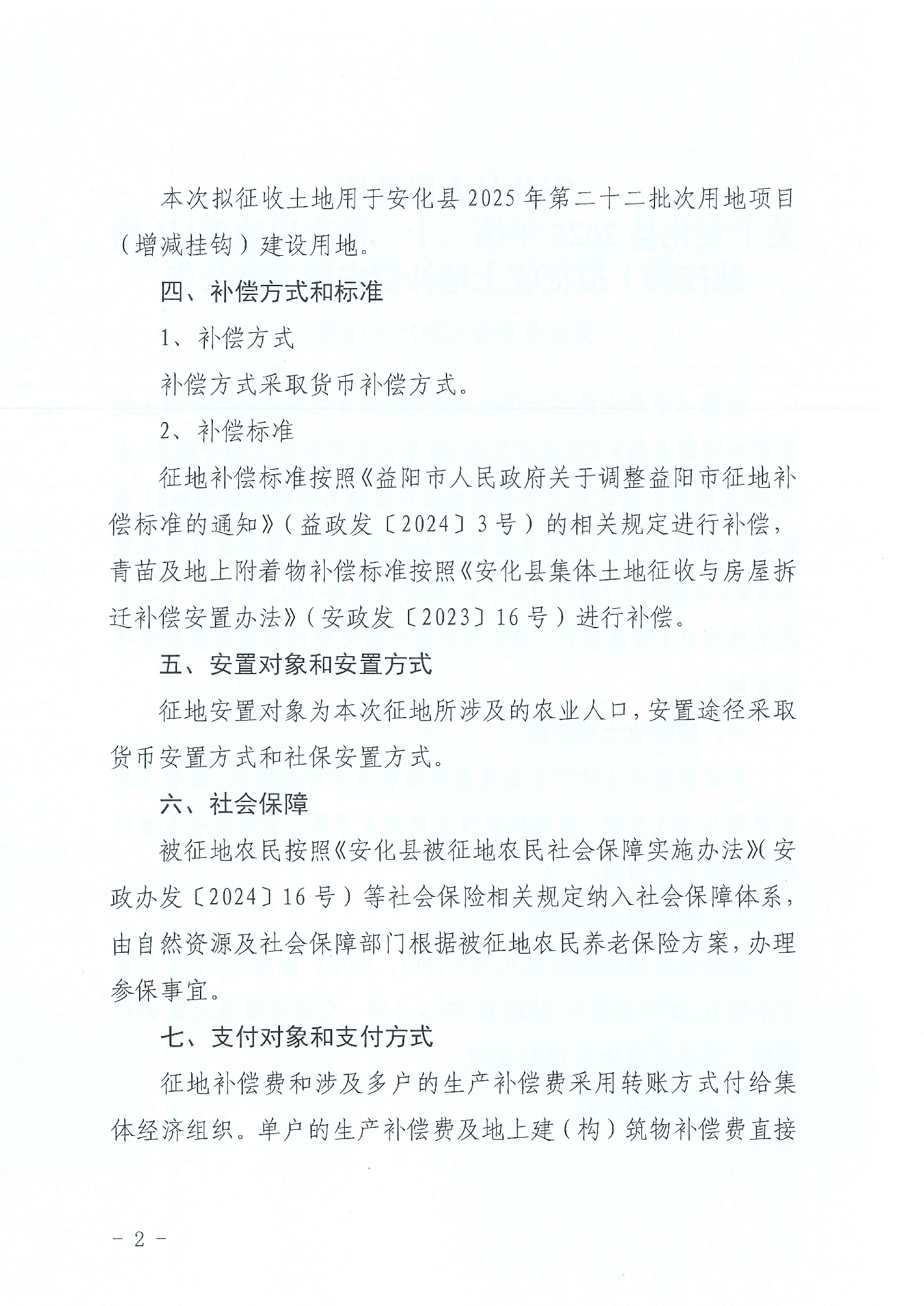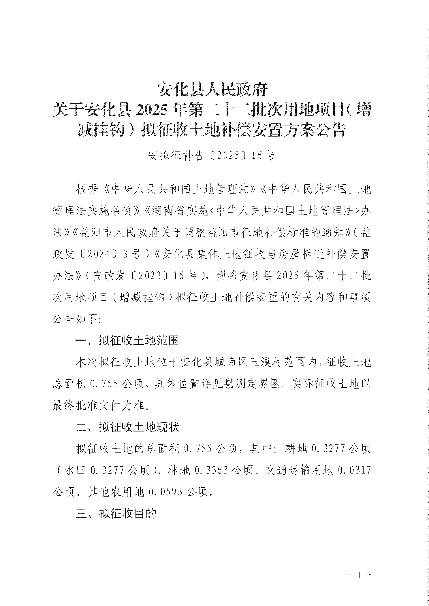 关于安化县2025年第二十二批次用地项目(增减挂钩)拟征收土地补偿安置方案公告