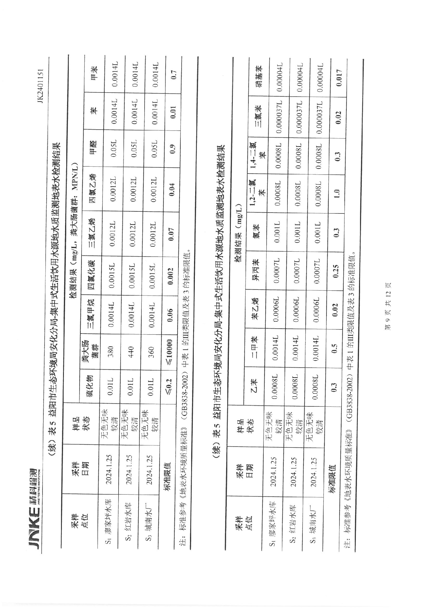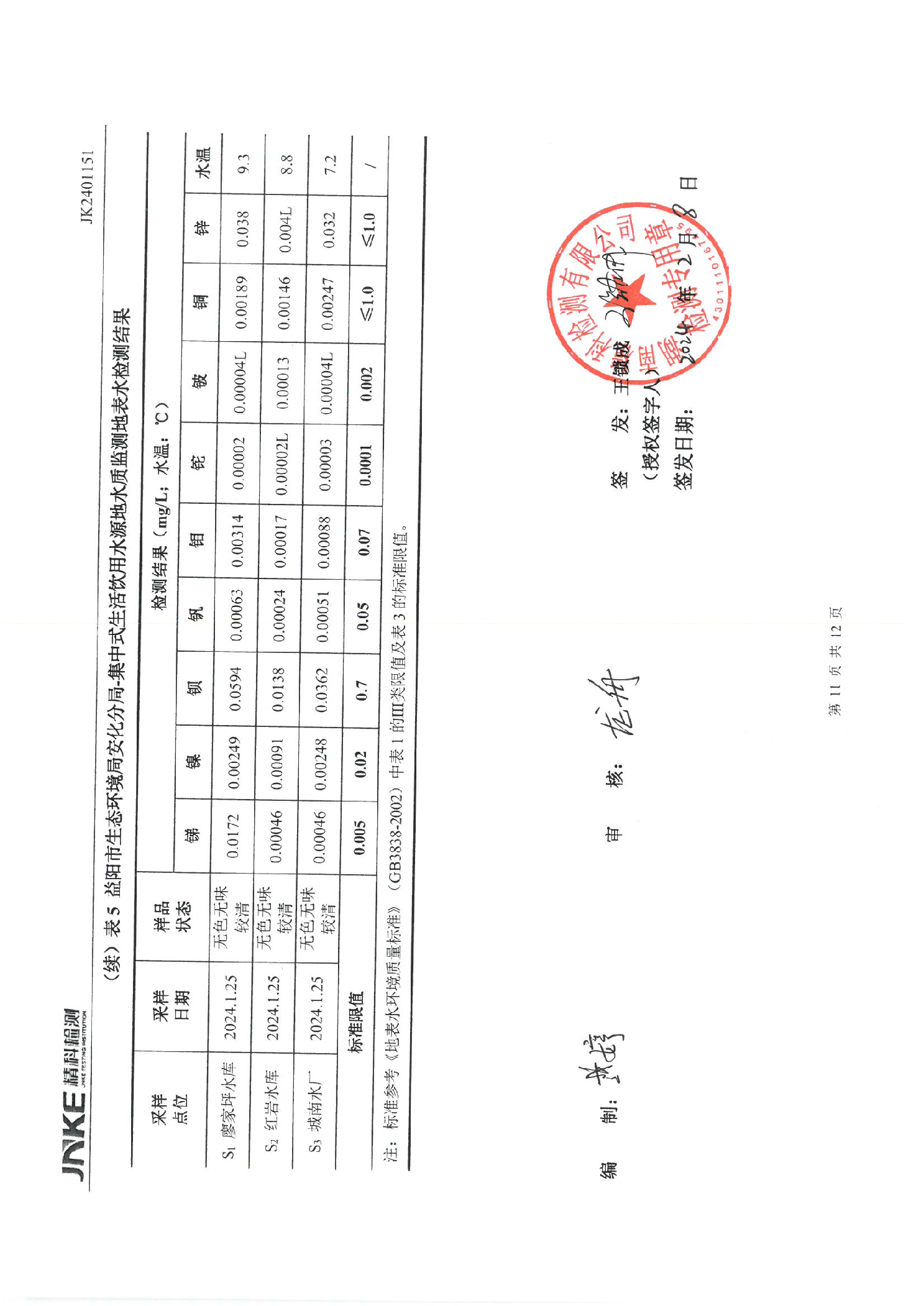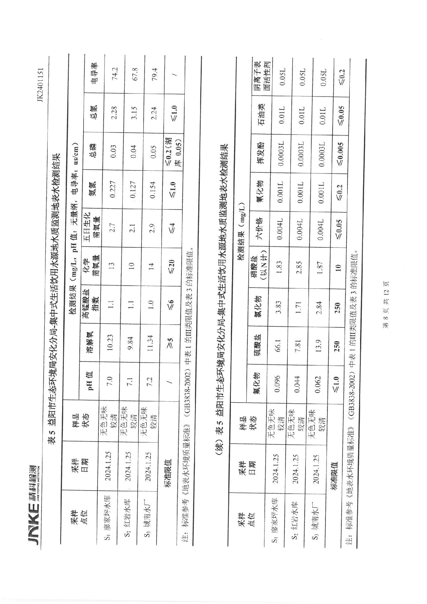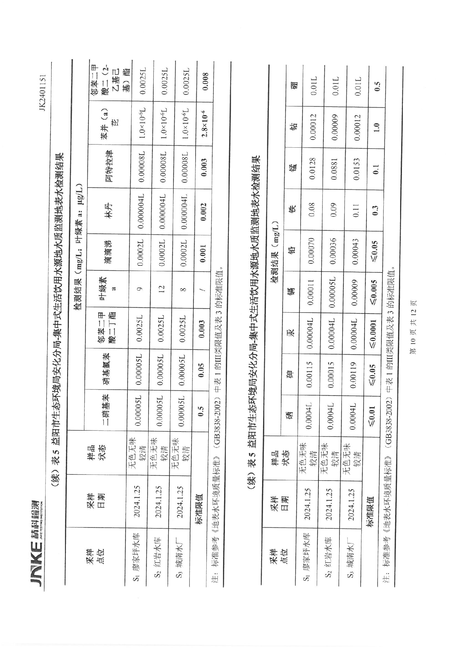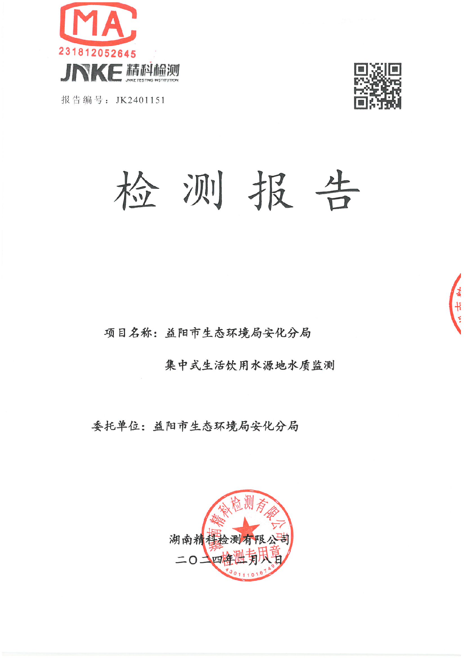 安化县2024年第一季度集中式生活饮用水源地水质监测
