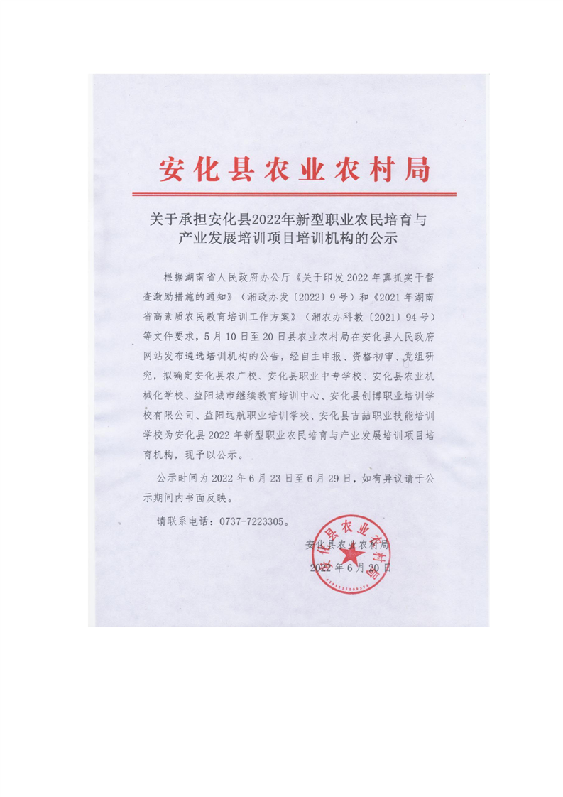 关于承担安化县2022年新型职业农民培训与产业发展培训项目培训机构的公示