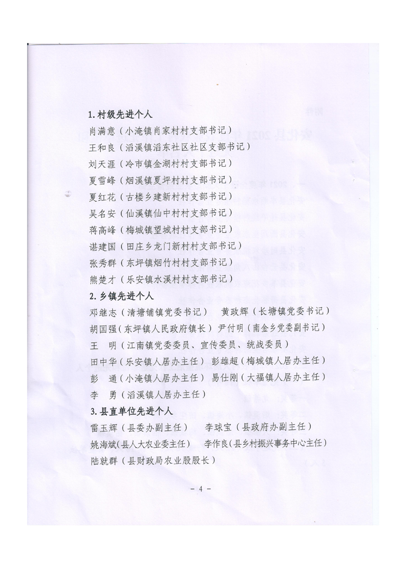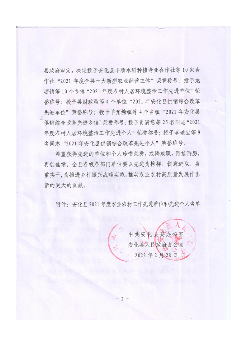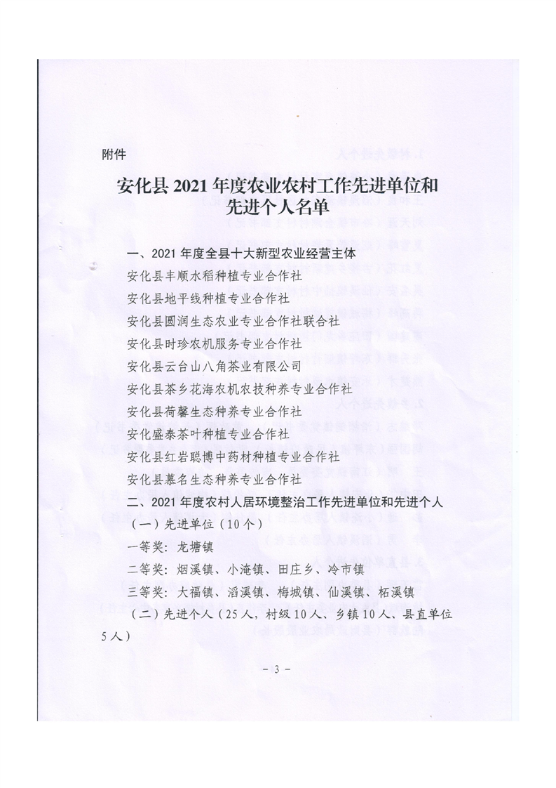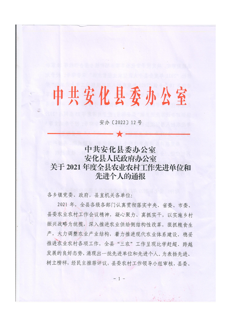 2021年度全县农业农村工作先进单位和先进个人的通报