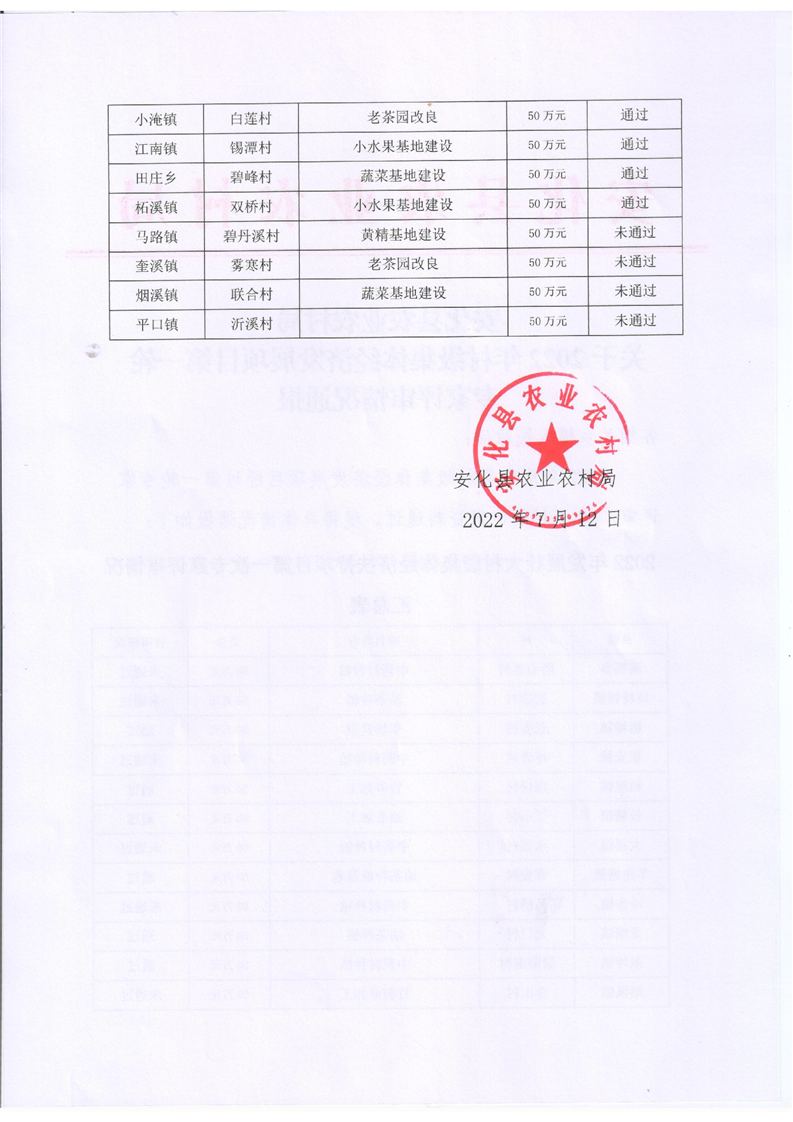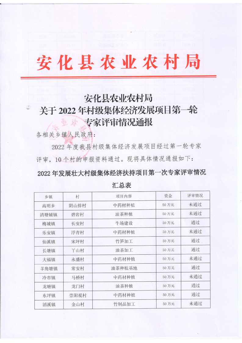 安化县农业农村局关于2022年村级集体经济发展项目第一轮专家评审情况通报