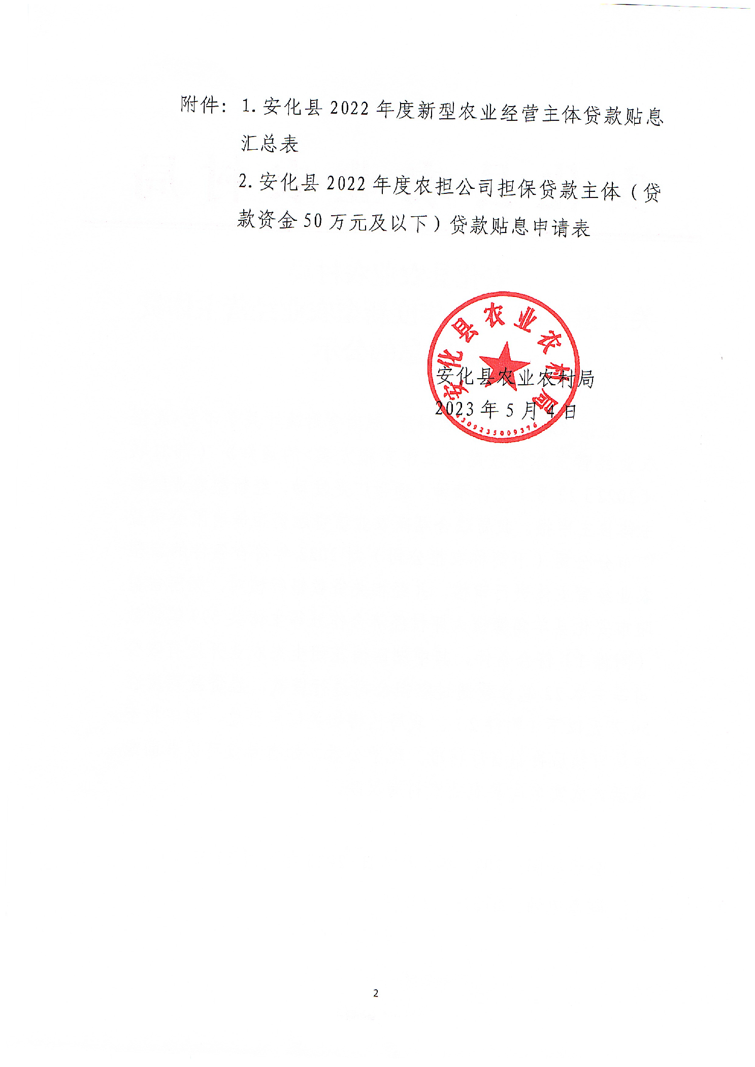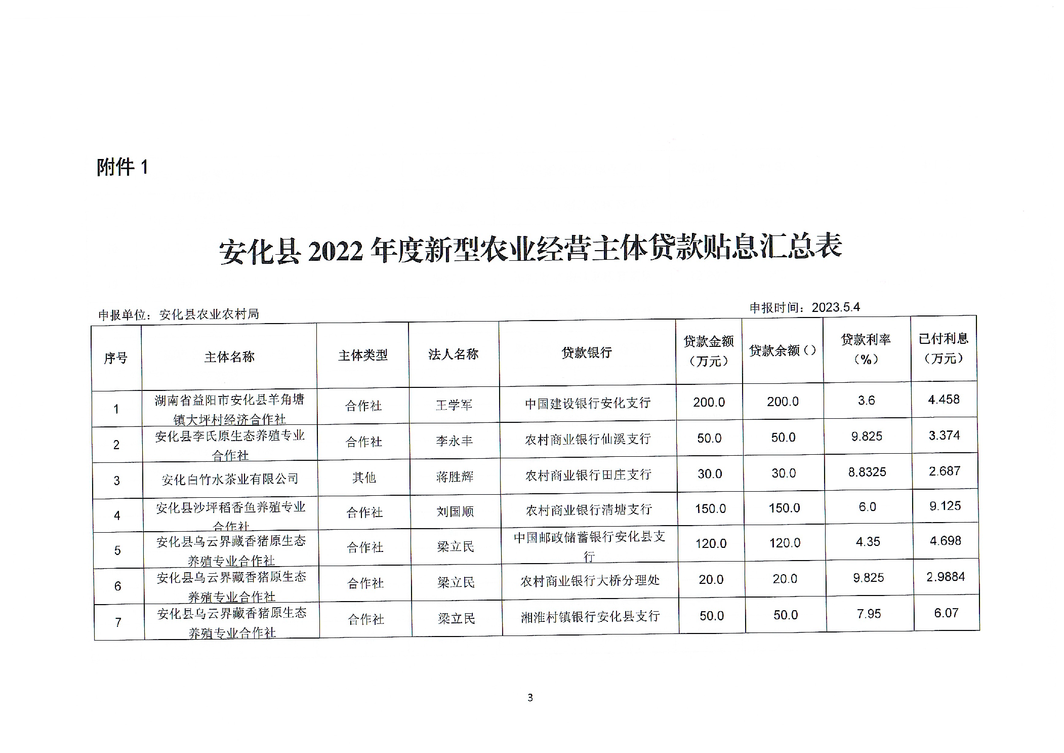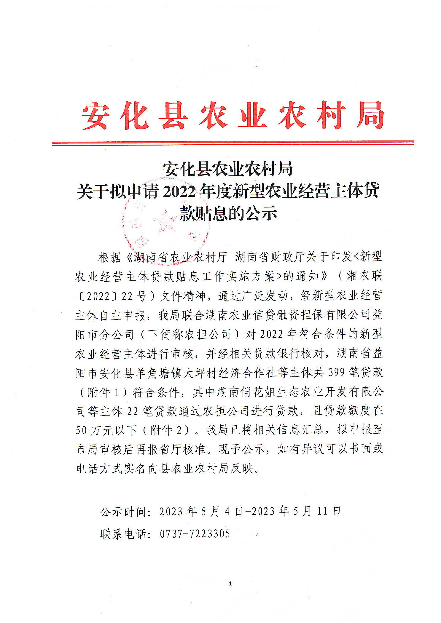 安化县农业农村局关于拟申请2022年度新型农业经营主体贷款贴息的公示