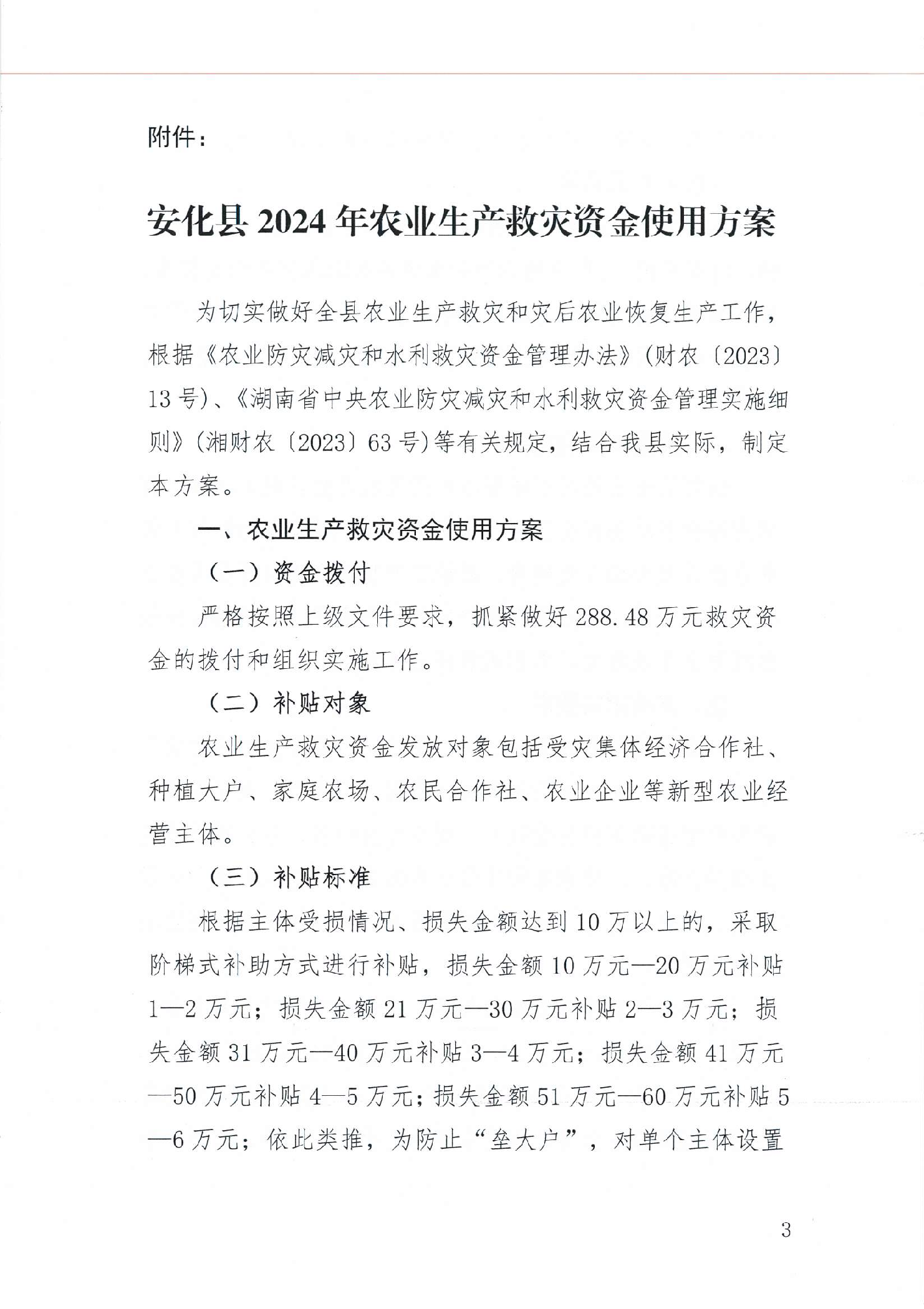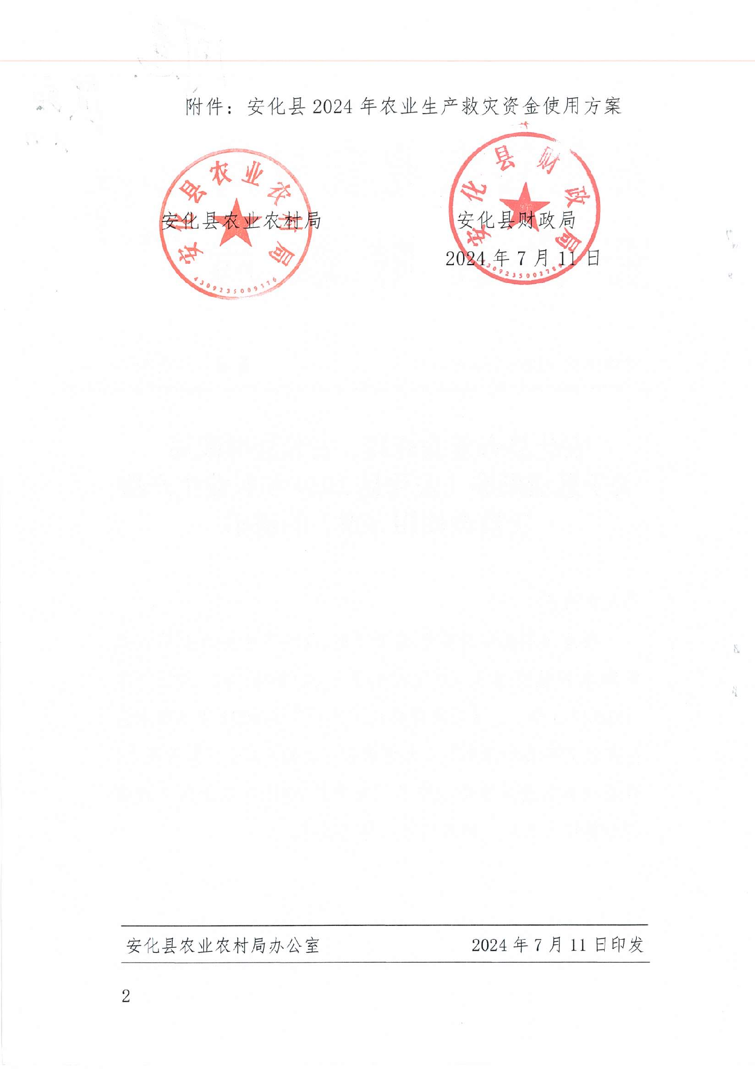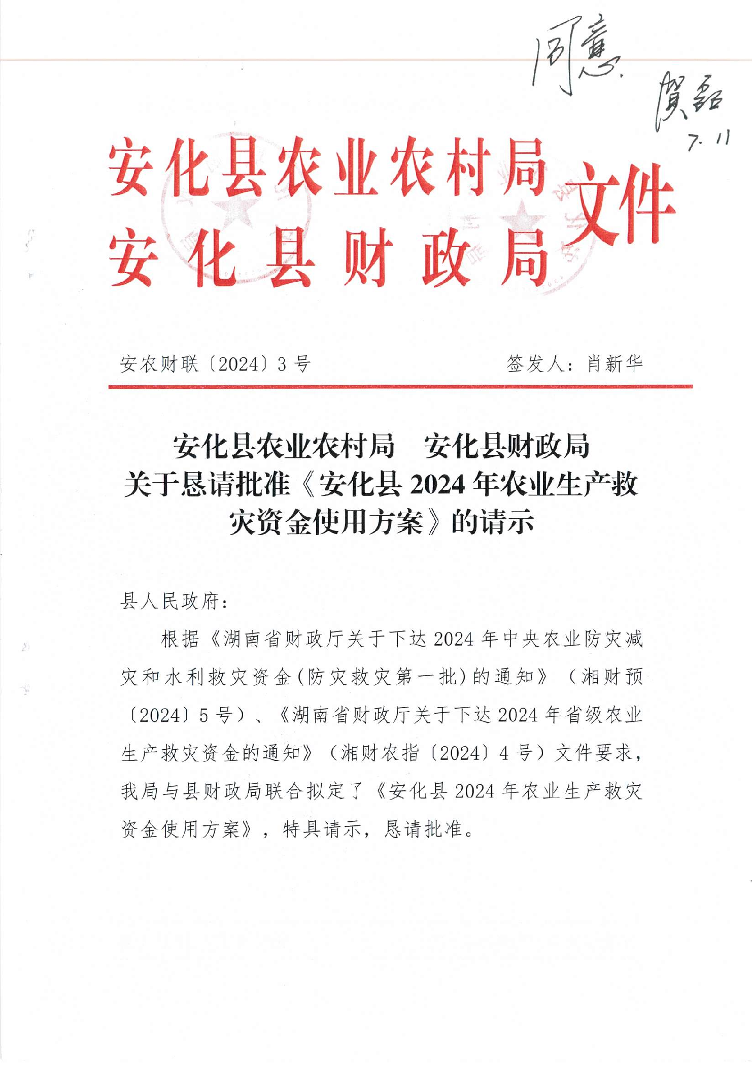 安化县农业农村局 安化县财政局关于恳请批准《安化县2024年农业生产救灾资金使用方案》的请示 安农财联〔2024〕3号