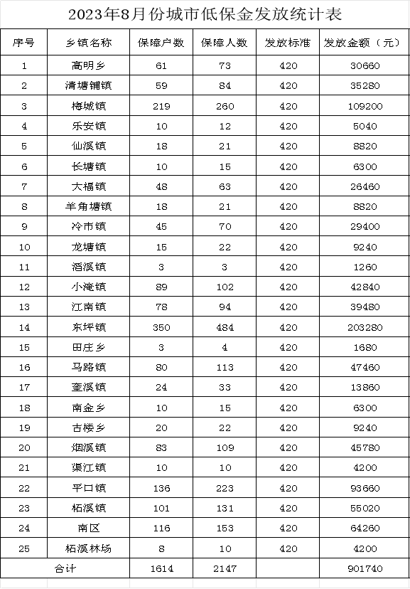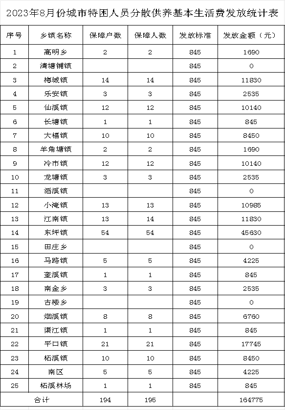 各乡镇财政所、社会事务办公室(或社会事务服务中心): 根据《安化县民政局安化县财政局关于提高困难群众救助保障相关标准的通知》(安民发〔2023〕11号)精神,拨付2023年8月份城乡最低生活保障、特困人员分散供养救助补助资金共计1328.7741万元,其中城乡低保金793.2045万元(城市低保90.1740万元、农村低保703.0305万元);城乡特困人员分散供养基本生活费451.6493万元(城市特困16.4775万元、农村特困435.1718万元);城乡特困人员分散供养照料护理费83.9203万元(城市特困5.4065万元、农村特困78.5138万元)。现将有关事项通知如下: 一、发放标准。一是低保金。城市低保金,每人每月420元;农村低保金,一档对象每人每月417元,二档对象每人每月245元,三档对象每人每月145元。二是特困基本生活费。城市特困基本生活费,每人每月845元;农村特困基本生活费,每人每月542元。三是特困照料护理费。半护理每人每月259元,全护理每人每月517元。 二、发放方式。救助补助资金通过惠民惠农财政补贴资金“一卡通”发放,各乡镇要及时通知对象到银行刷卡领取。 三、工作要求。建立备案制度,完善“一户一档”资料。加强动态管理,符合条件的对象要及时纳入保障范畴,不符合条件的对象要及时清退核减,做到应保尽保,应退尽退。