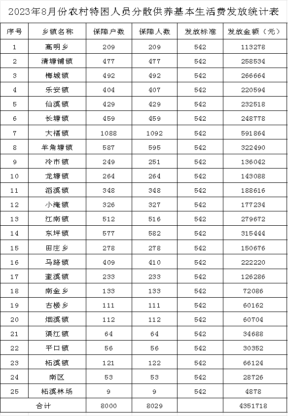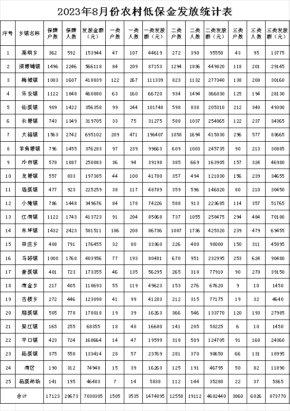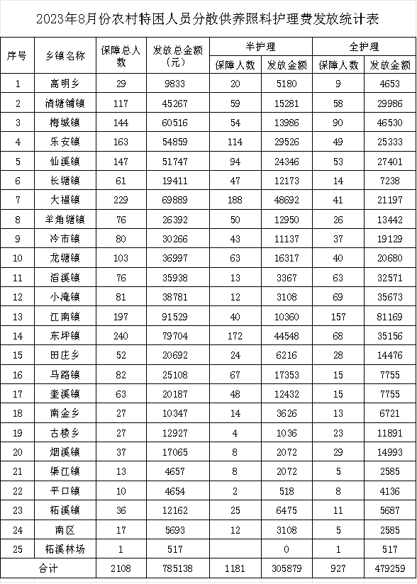 附件:1.2023年8月份城市低保金发放统计表 2.2023年8月份农村低保金发放统计表 3.2023年8月份城市特困人员分散供养基本生活 费发放统计表 4.2023年8月份农村特困人员分散供养基本生活 费发放统计表 5.2023年8月份城市特困人员分散供养照料护理 费发放统计表 6.2023年8月份农村特困人员分散供养照料护理费发放统计表