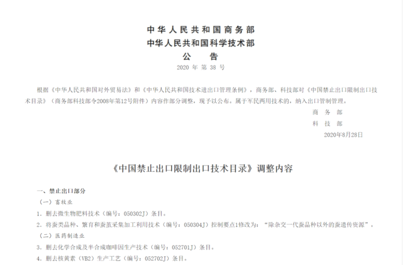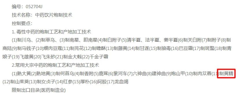 2020年8月28日,商务部、科技部发布“关于调整《中国禁止出口限制出口技术目录》的公告(2020年38号)”,这是12年后对2008年发布的目录进行了调整,制黄精炮制工艺和产地加工技术仍然被纳入禁止出口技术目录。