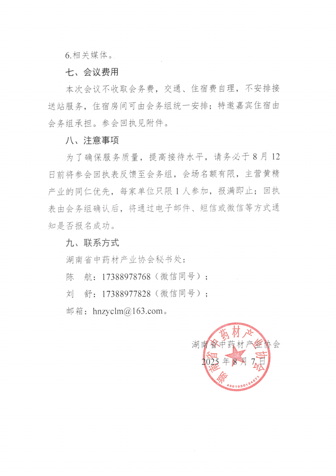 为了确保服务质量,提高接待水平,请务必于8月12日前将参会回执表反馈至会务组,会场名额有限,主营黄精产业的同仁优先,每家单位只限1人参加,报满即止;回执表由会务组确认后,将通过电子邮件、短信或微信等方式通知是否报名成功。