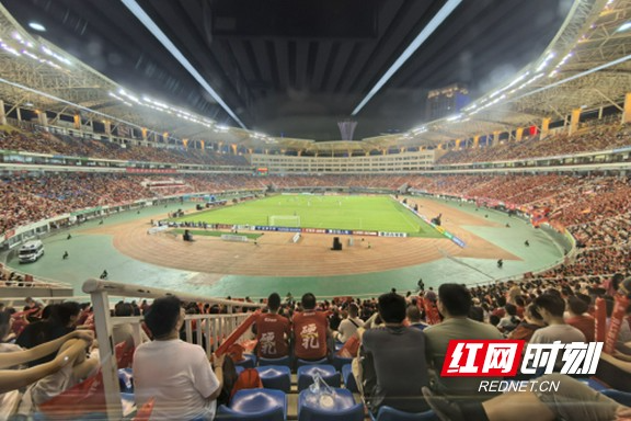 红网时刻新闻10月11日益阳讯(记者 赵佳妮 实习生 张志成 通讯员 麻秀萍 瞿强)10月10日晚,2025年湖南省足球超级联赛(以下简称“湘超联赛”)第五轮的一场焦点对决在贺龙体育馆激情上演,长沙队坐镇主场迎战衡阳队。40956名球迷的热情呐喊,让贺龙体育馆化作一片红色的海洋。