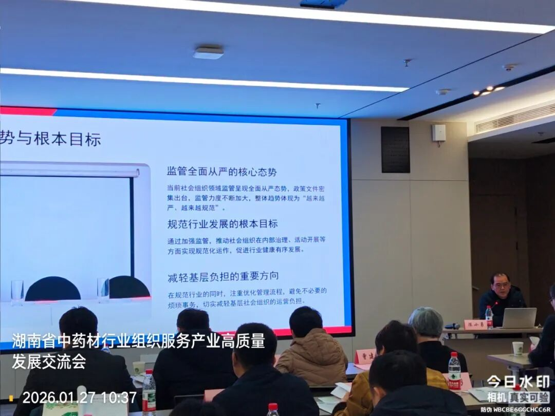 为进一步提升我省中药材产业相关组织“服务国家、服务社会、服务群众、服务行业”的综合能力,解读产业政策,凝聚发展共识,共同推动我省中药材产业高质量协同发展,1月27日,湖南省中药材产业协会(以下简称“省中药材协会”)、湖南会展集团有限责任公司组织的湖南省中药材行业组织服务产业高质量发展交流会在长沙顺利举行。湖南省农业农村厅、工业和信息化厅、中医药管理局等省直部门和地方中药材主管部门领导,中国中药协会、湖南省社会组织促进会、湖南省医药行业协会中药饮片产业分会和地方协会代表,湖南省中药材产业技术体系试验站站长等专家,共80余人参加会议。