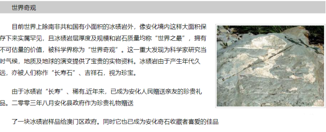 据考证,冰碛岩形成距今约6—7亿年间。当时,地球上曾发生了全球性冰盖气候的“冰球事件”,冰期后,又发生了“热室气候”。这种极热和极冷的现象,便形成了稀罕少见的冰碛岩。冰碛岩区,含锌、硒等人体所需的微量元素特别丰富。