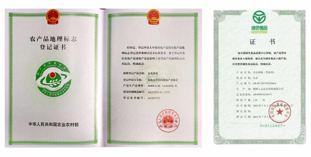九志农业是安化黄精国家农产品地理标志的创始单位、湖南省高新技术企业、湖南省“安化黄精”星创天地的主创单位,以及《黄精采收与产地初加工技术规范》等多个团体与行业标准的主要参与制订者。