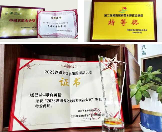 9月,九志“烧巴味”即食黄精在“2023 湖南省文化旅游商品大赛”中荣获铜奖后,同月,又在第二届湖南花博会上荣获特等奖;11月,九志“烧巴味”即食黄精在第二十四届中国中部(湖南)农博会上斩获金奖,成为2023首届“安化黄精丰收节”活动的指定品鉴产品。
