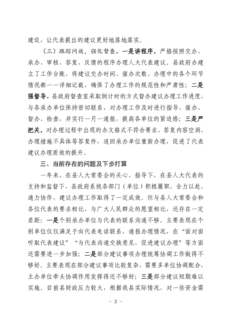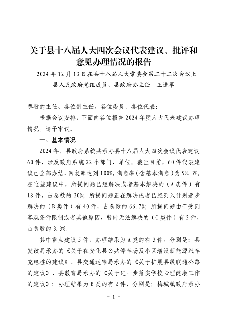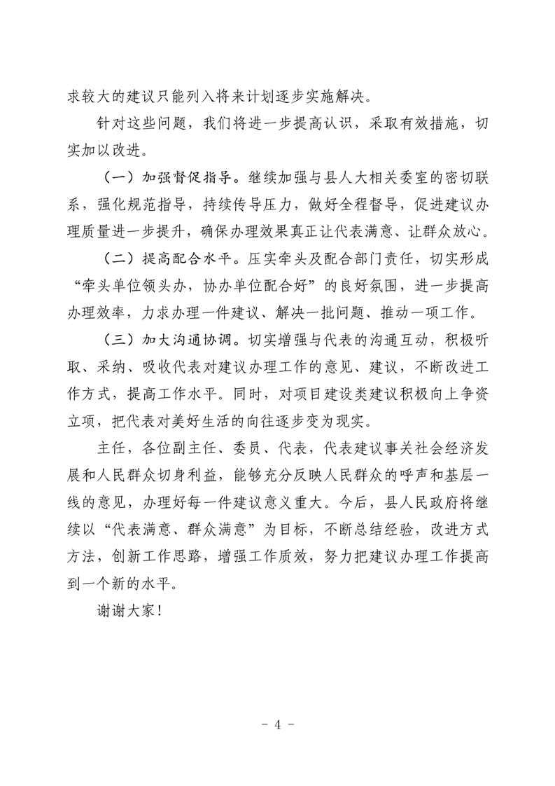 关于县十八届人大四次会议代表建议、批评和 意见办理情况的报告