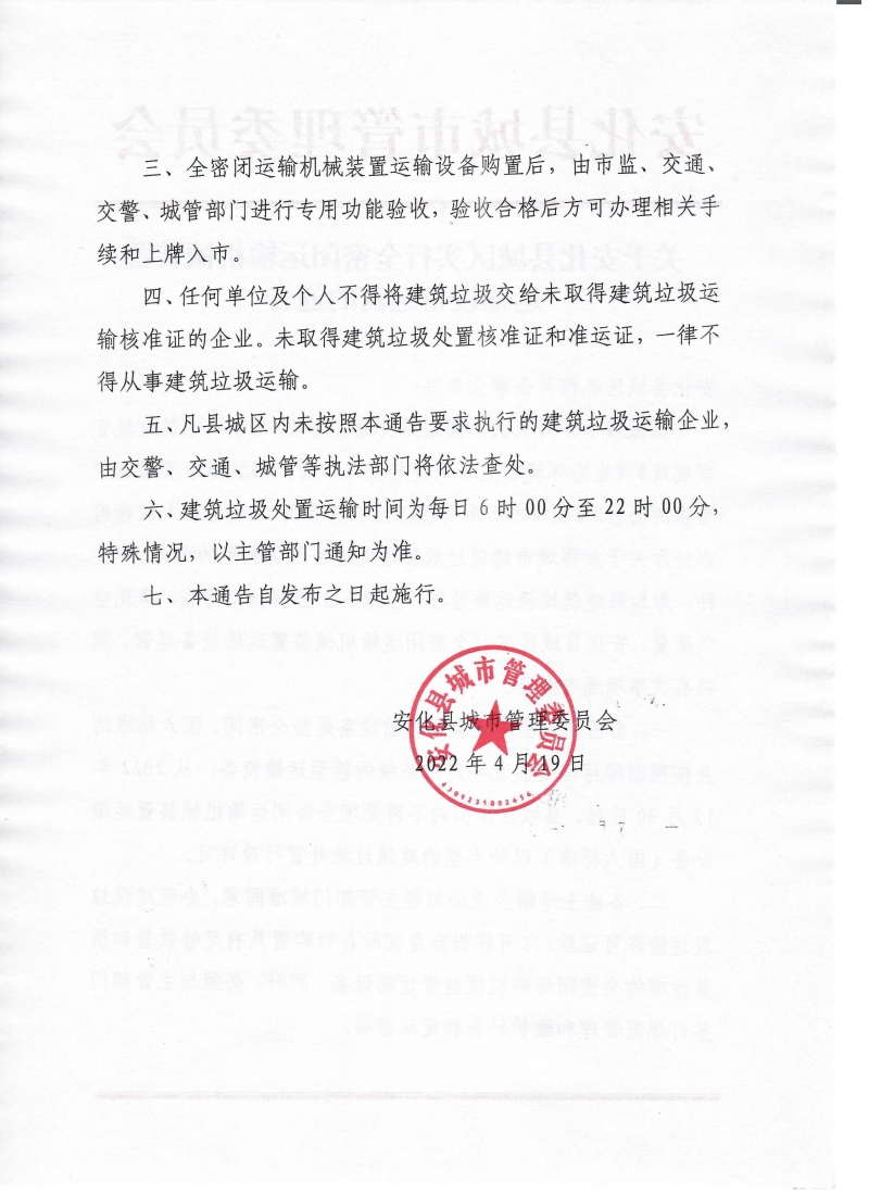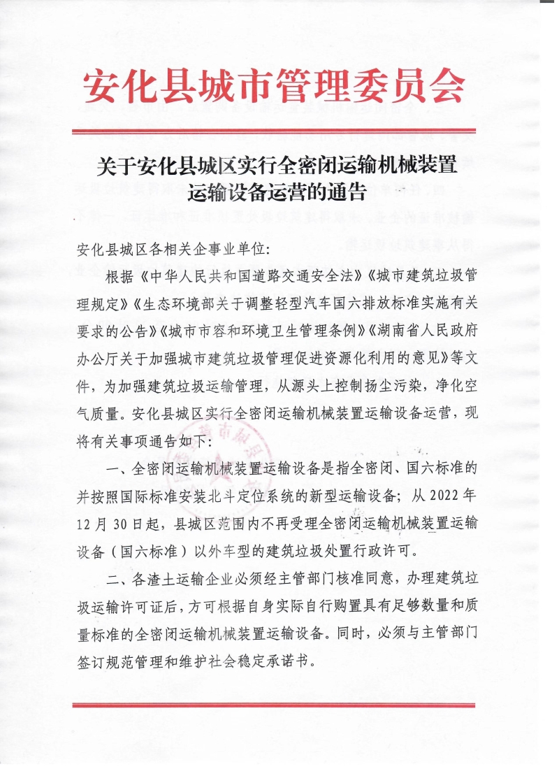 关于县城区实行全密闭运输机械装置运输设备运营的通告