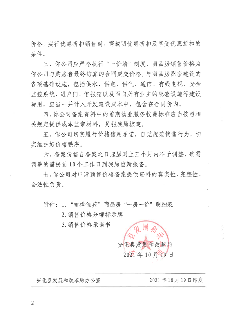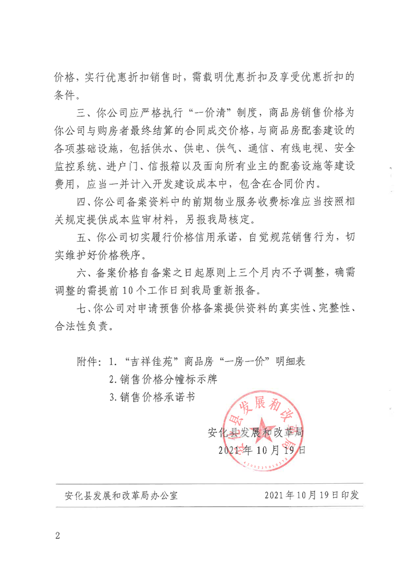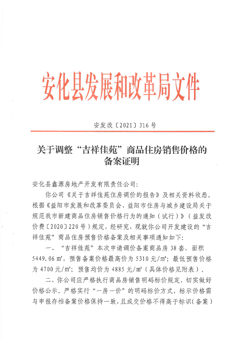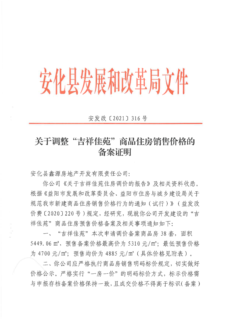 关于调整“吉祥佳苑”商品住房销售价格的备案证明